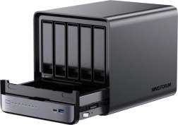 Le MINISFORUM N5 Pro établit la référence dans la catégorie des NAS/mini PC compacts. Le AMD Ryzen AI 9 HX Pro 370 12 cœurs avec architecture Zen 5 + Zen 5c et le GPU Radeon 890M assurent une lecture fluide en 4K/8K, un traitement parallèle et une inférence IA locale jusqu’à 50 TOPS. Le châssis avec 5 baies hot-swap pour disques, trois emplacements M.2/U.2 NVMe et la prise en charge RAID 0/1/5/6 offre jusqu’à 144 To de capacité.