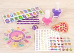 - 2× vernis à ongles, lime à ongles, 2× planche d’autocollants, planche de boucles d’oreilles adhésives, strass décoratifs, bague