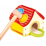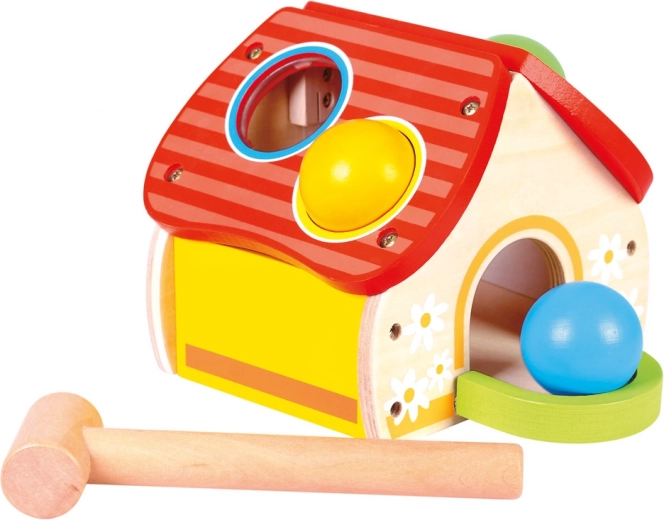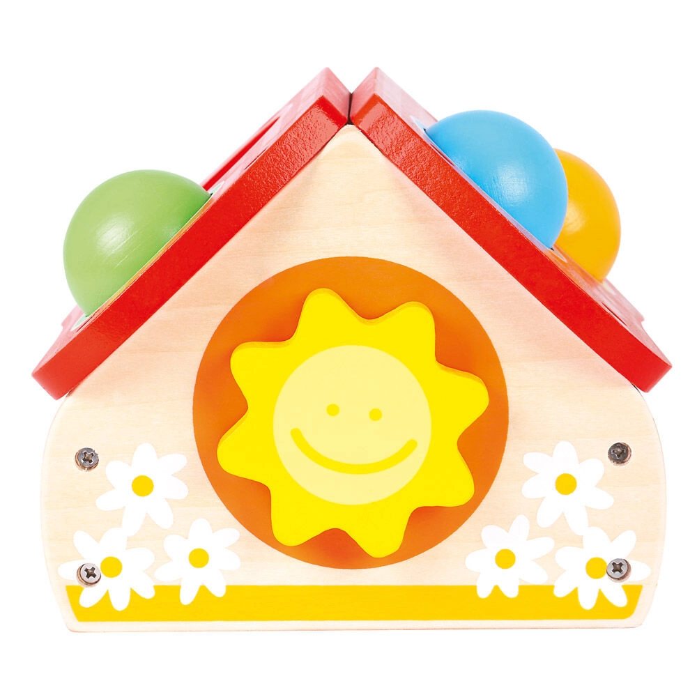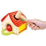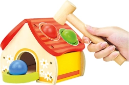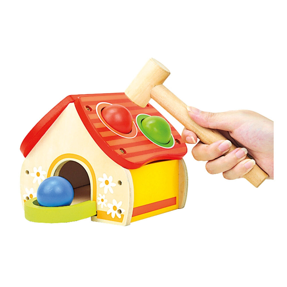 Ce jouet en bois de qualité en forme de petite maison gaie attire les enfants par ses couleurs vives et le principe simple du jeu : on insère les balles dans les ouvertures du toit, puis on les enfonce délicatement avec le marteau. Une activité ludique qui favorise la motricité, la patience et la précision.