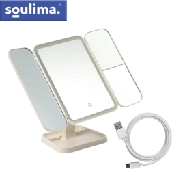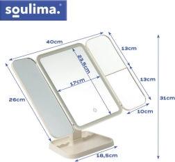 Le miroir cosmétique élégant SOULIMA transforme votre coiffeuse en un petit studio beauté. Sa structure pliable en trois volets avec miroir central et deux ailes latérales offre plusieurs angles de vue, tandis que le grossissement 2× et 3× facilite un maquillage précis. Le rétroéclairage LED à température réglable de 3000 à 7000 K garantit des couleurs naturelles en toutes circonstances. Un contrôle tactile pratique, une rotation jusqu’à 270° et une batterie intégrée de 600 mAh avec charge USB‑C font de ce miroir un accessoire à la fois stylé et fonctionnel.