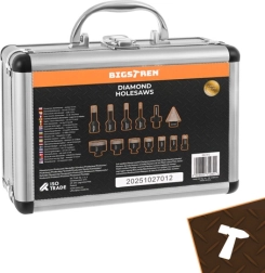 - 11× couronne diamantée, 1× fraise conique 2–35 mm, 1× adaptateur pour perceuse, mallette en aluminium renforcée, notice multilingue