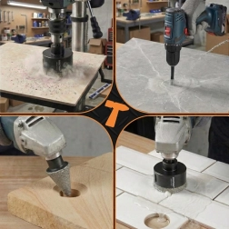 La plage de diamètres de 6–68 mm couvre les travaux d’installation et de montage les plus courants (robinetterie, prises, passages). La fraise conique 2–35 mm est idéale pour l’ébavurage des arêtes, l’agrandissement et le réglage fin des trous. Le filetage M14 universel est compatible avec les meuleuses d’angle ; grâce à l’adaptateur inclus, vous pouvez facilement connecter une perceuse classique.