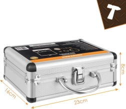 Grâce au filetage M14, les scies cloches s’utilisent sur meuleuse d’angle ; avec l’adaptateur fourni, également sur une perceuse standard. La fraise conique 2–50 mm facilite le chanfreinage, la calibration et l’agrandissement précis des trous. Le tout est rangé de manière ordonnée dans une solide valise de transport en aluminium avec mousse de protection pour un transport en toute sécurité.