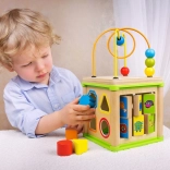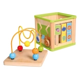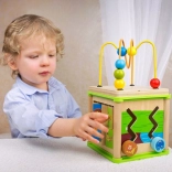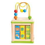 Cette cube d’activités multifonction réunit cinq activités appréciées : encastrement de formes, engrenages, pistes sinueuses avec pièces coulissantes, association d’animaux à leur nourriture et labyrinthe de perles sur le dessus. Chaque face est conçue pour stimuler la coordination œil–main, la patience et la concentration.
