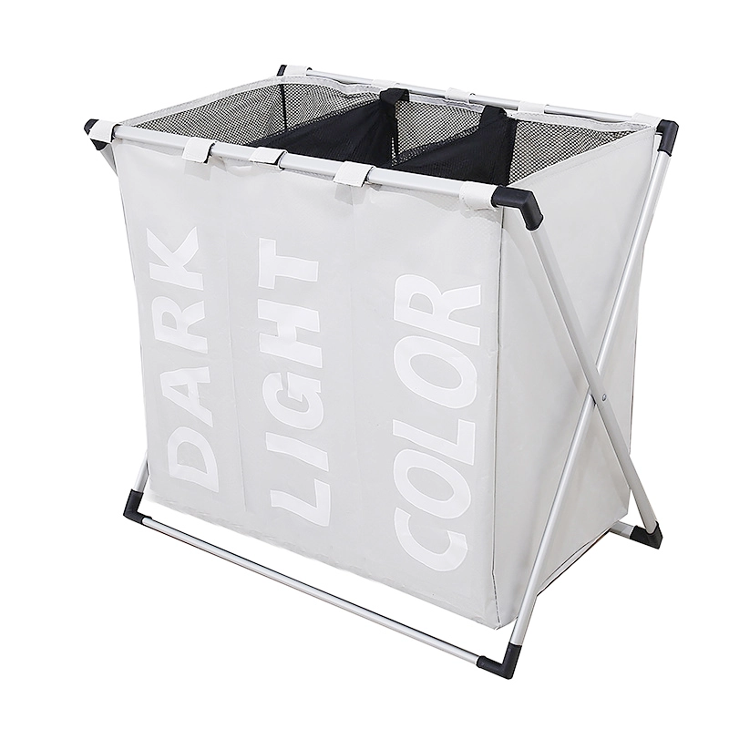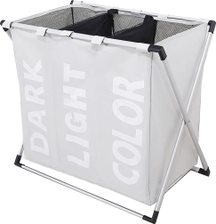 Pratique panier à linge de tri à trois compartiments séparés pour DARK, LIGHT et COLOR, qui facilite la lessive dès la collecte. Sacs imperméables et résistants, armature en aluminium légère et structure pliante avec poignées et attaches à velcro pour un montage rapide et une utilisation même sans support.