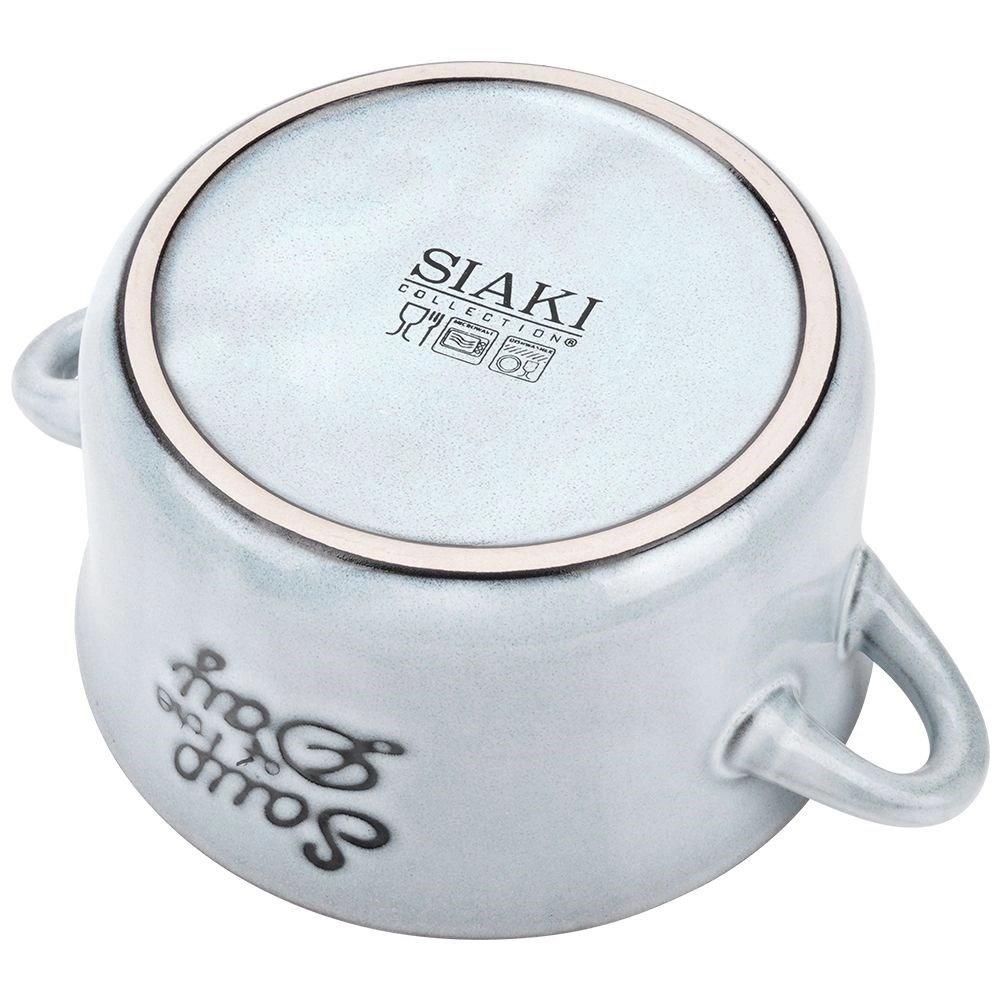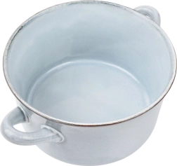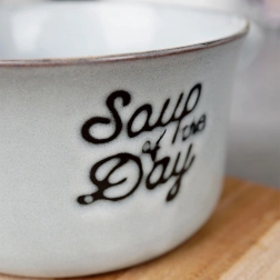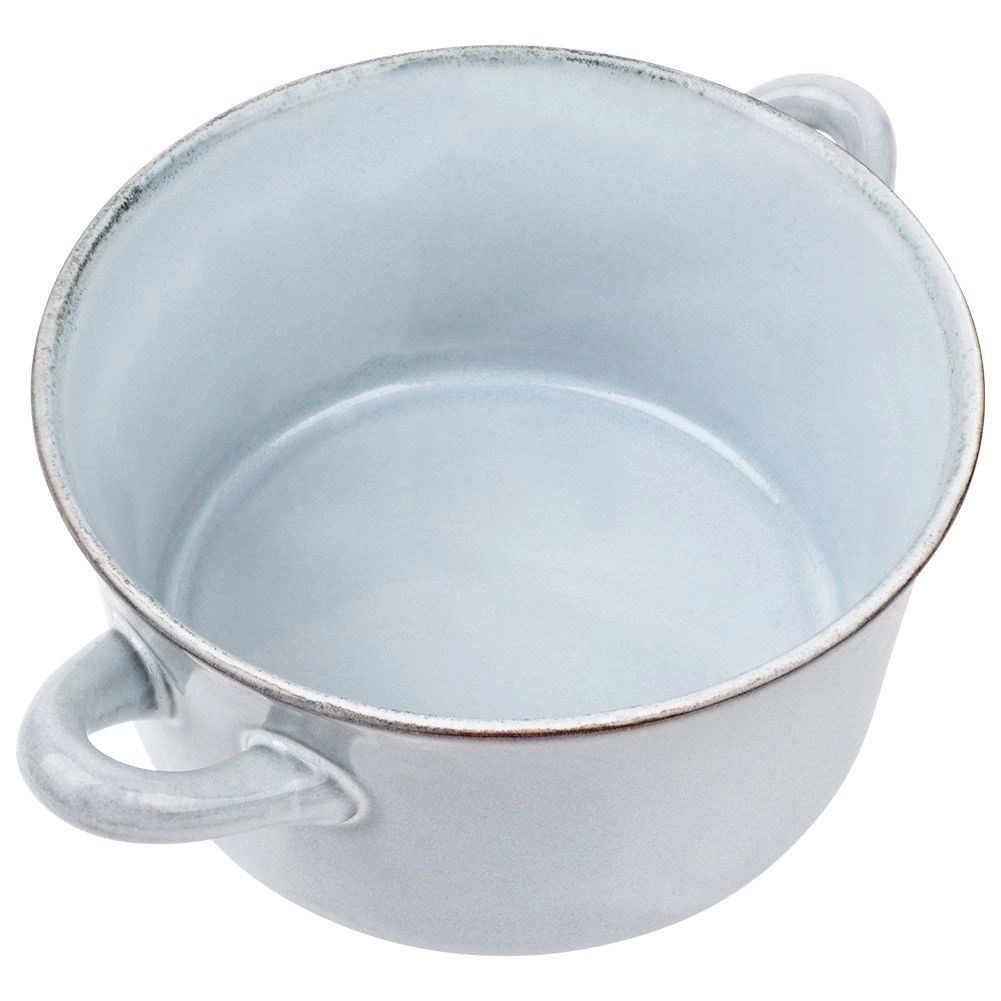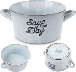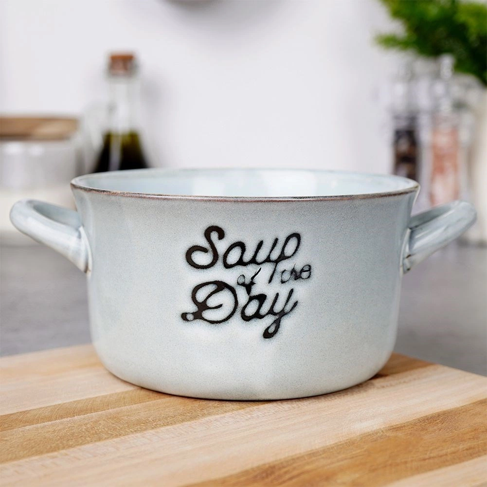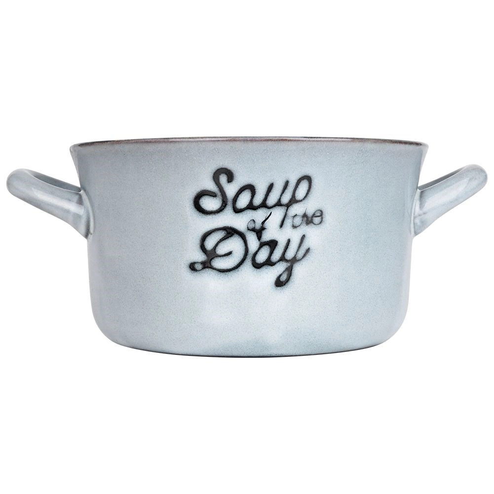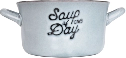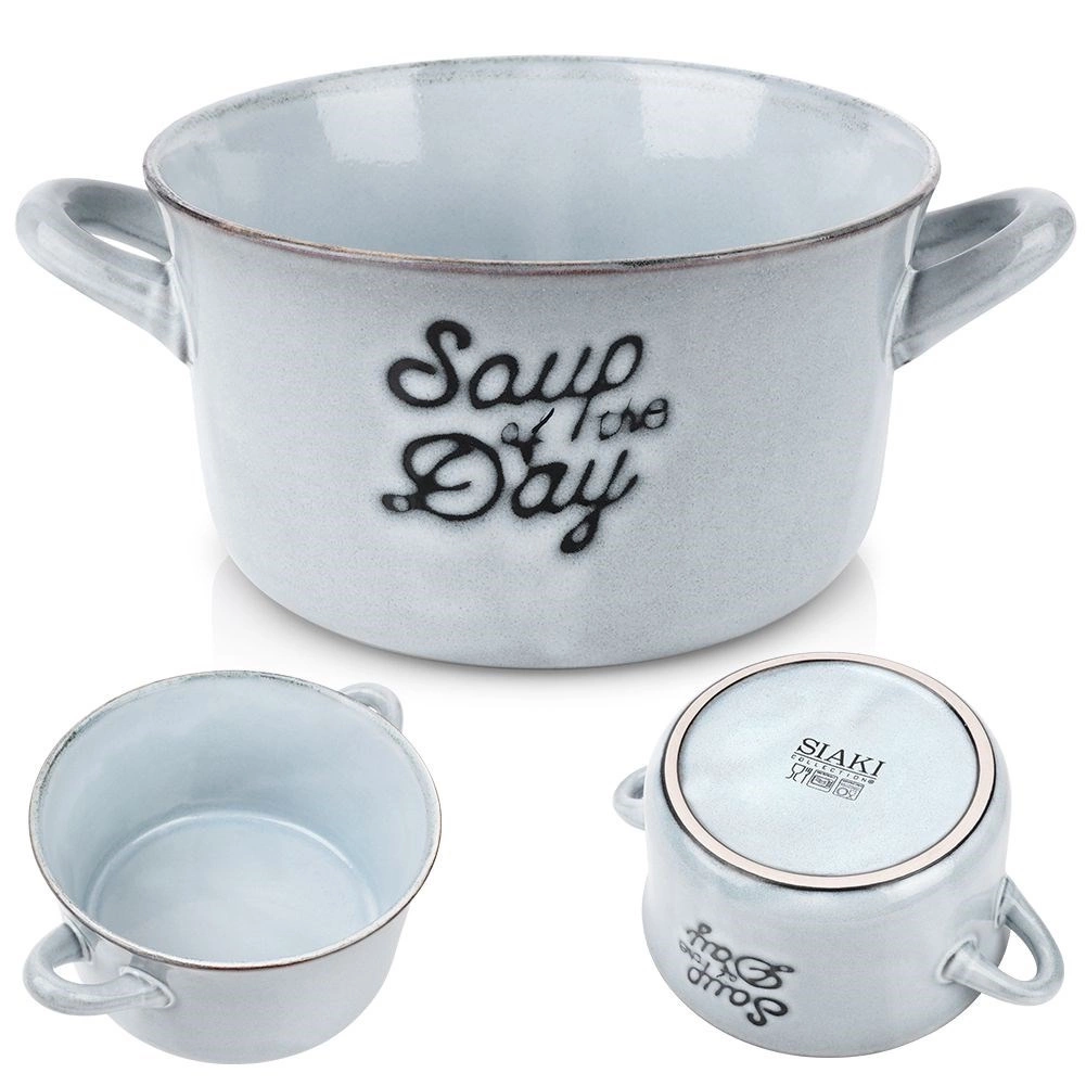 Bol à bouillon stylé de 600 ml en céramique de qualité, de couleur bleu clair, idéal pour servir des souppes, bouillons et veloutés. Grâce à ses deux anses latérales, il se transporte facilement, la surface émaillée facilite le nettoyage et ses dimensions pratiques conviennent à un usage quotidien. Compatible lave-vaisselle et four à micro-ondes.