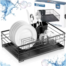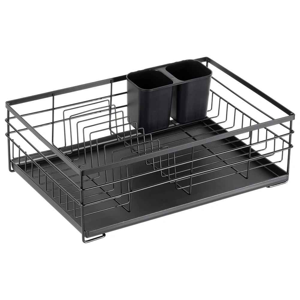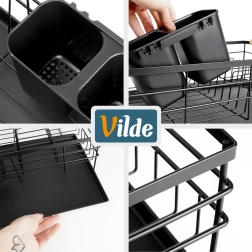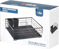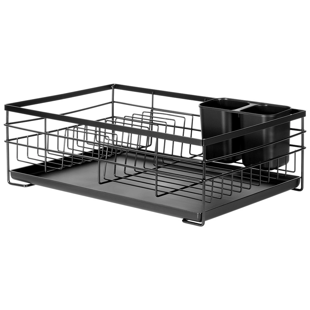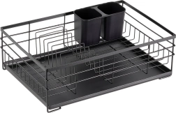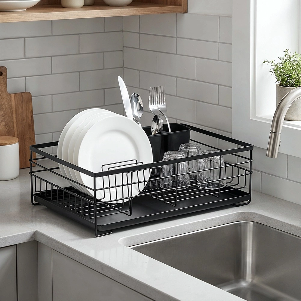 Élégant égouttoir au style industriel loft qui garde votre cuisine propre et organisée. Sa structure métallique robuste en finition noire, le plateau d’égouttage en plastique amovible et le panier à couverts à deux compartiments garantissent un séchage pratique et hygiénique après le lavage à la main.