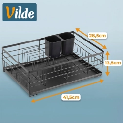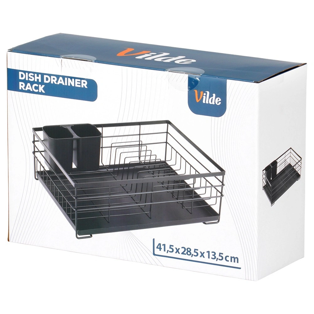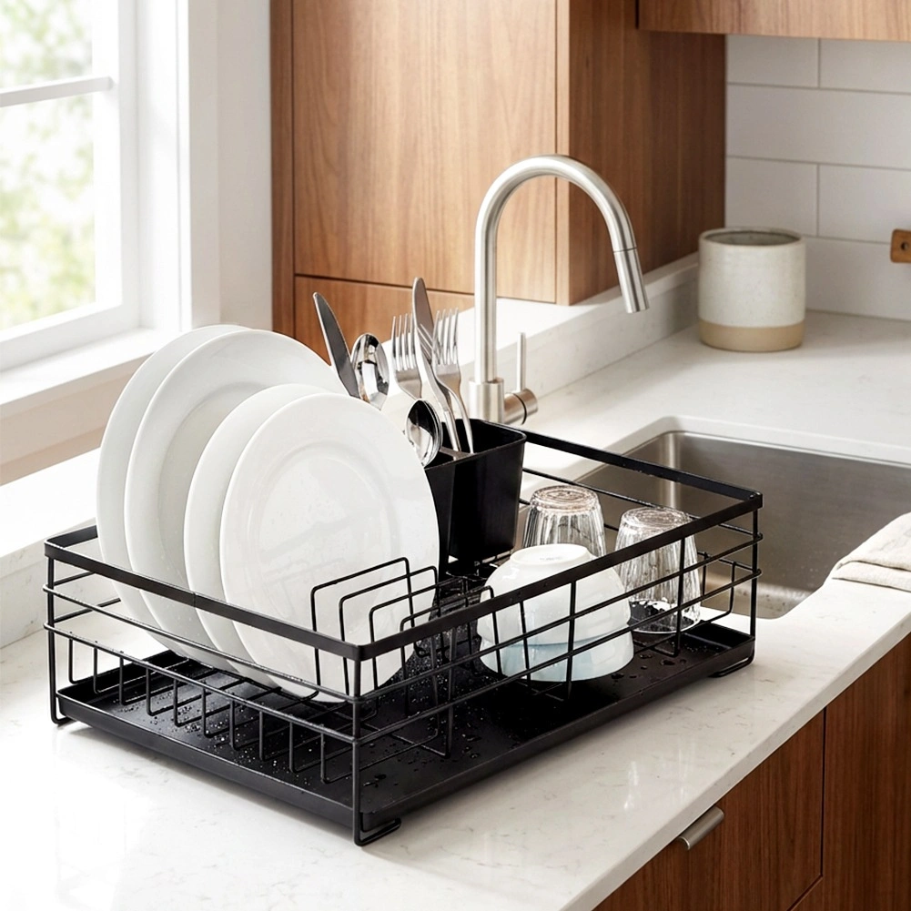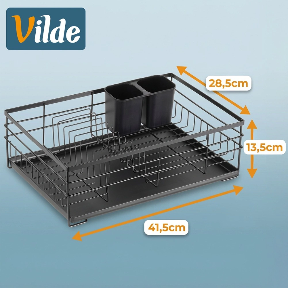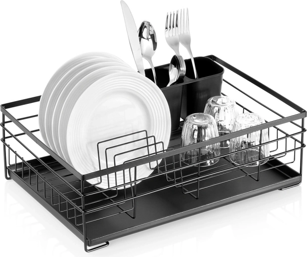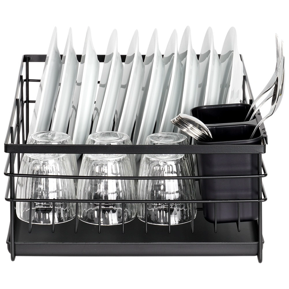 Grâce à une conception bien pensée, l’égouttoir offre de la place pour jusqu’à 10 assiettes, de l’espace pour verres et bols, ainsi qu’un panier pouvant être placé à l’intérieur ou à l’extérieur de la structure. Ses dimensions compactes économisent de la place sur le plan de travail et facilitent l’usage quotidien comme le nettoyage.