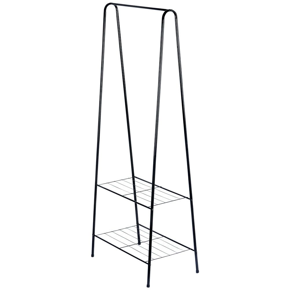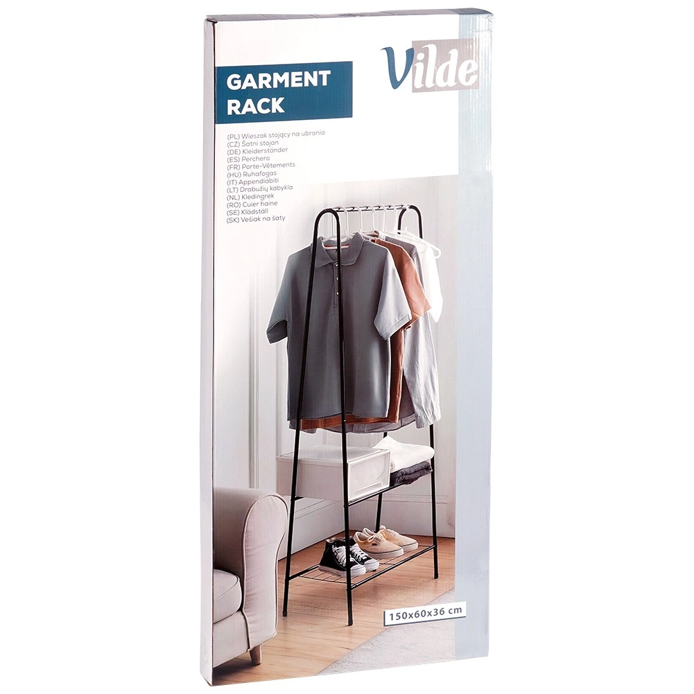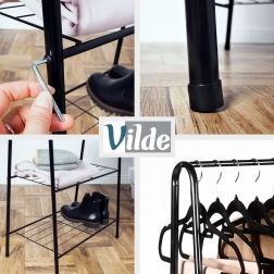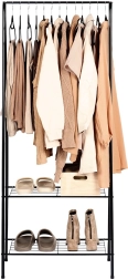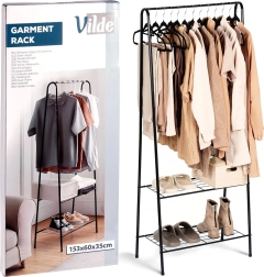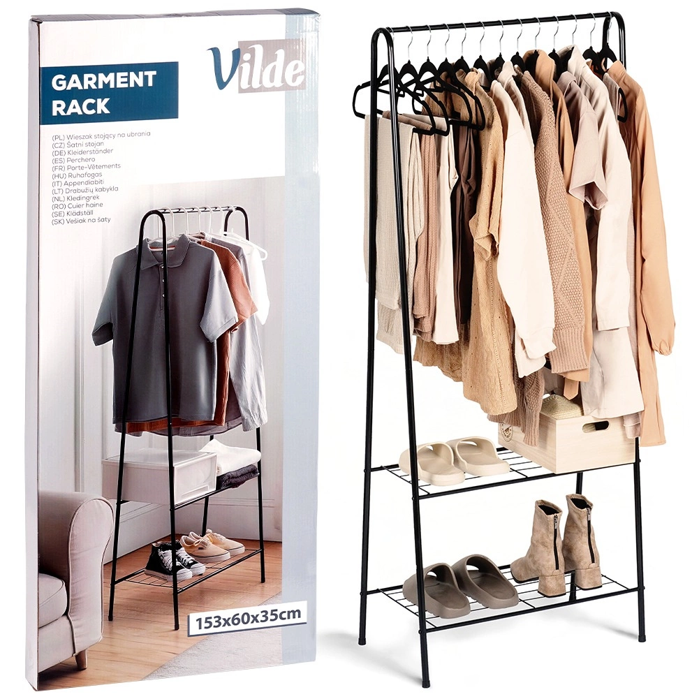 Ce portant autoportant en métal, de dimensions 60 × 35 × 153 cm, fournit un espace fiable et élégant pour suspendre chemises, manteaux ou robes, tandis que la paire d’étagères inférieures garde vos chaussures, boîtes ou accessoires bien organisés et à portée de main. Son design ouvert et minimaliste s’intègre facilement aux intérieurs modernes.