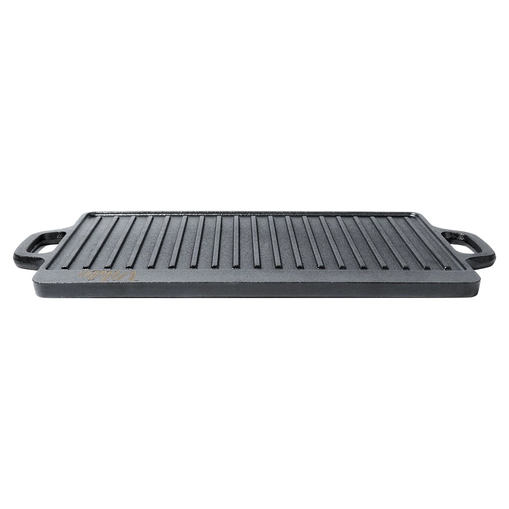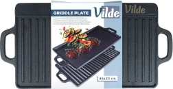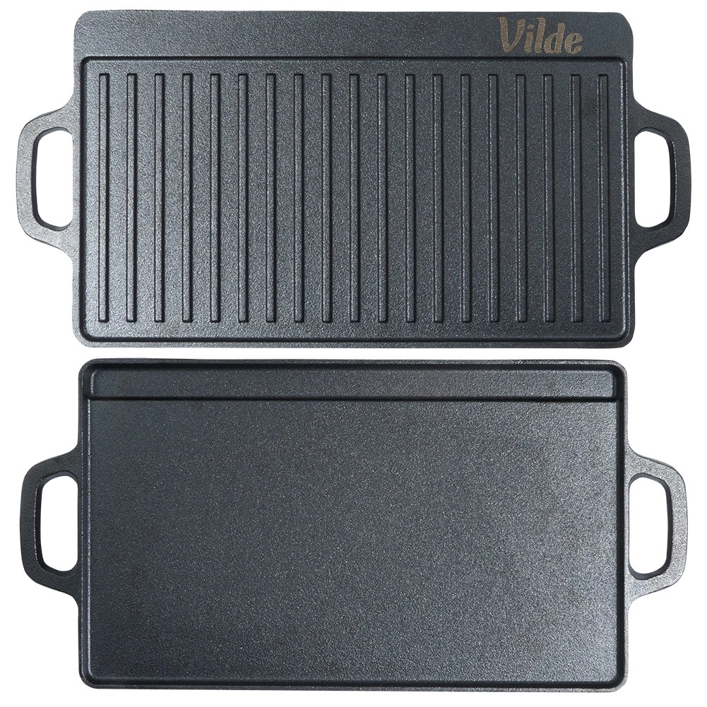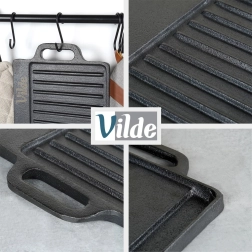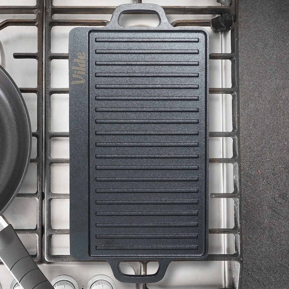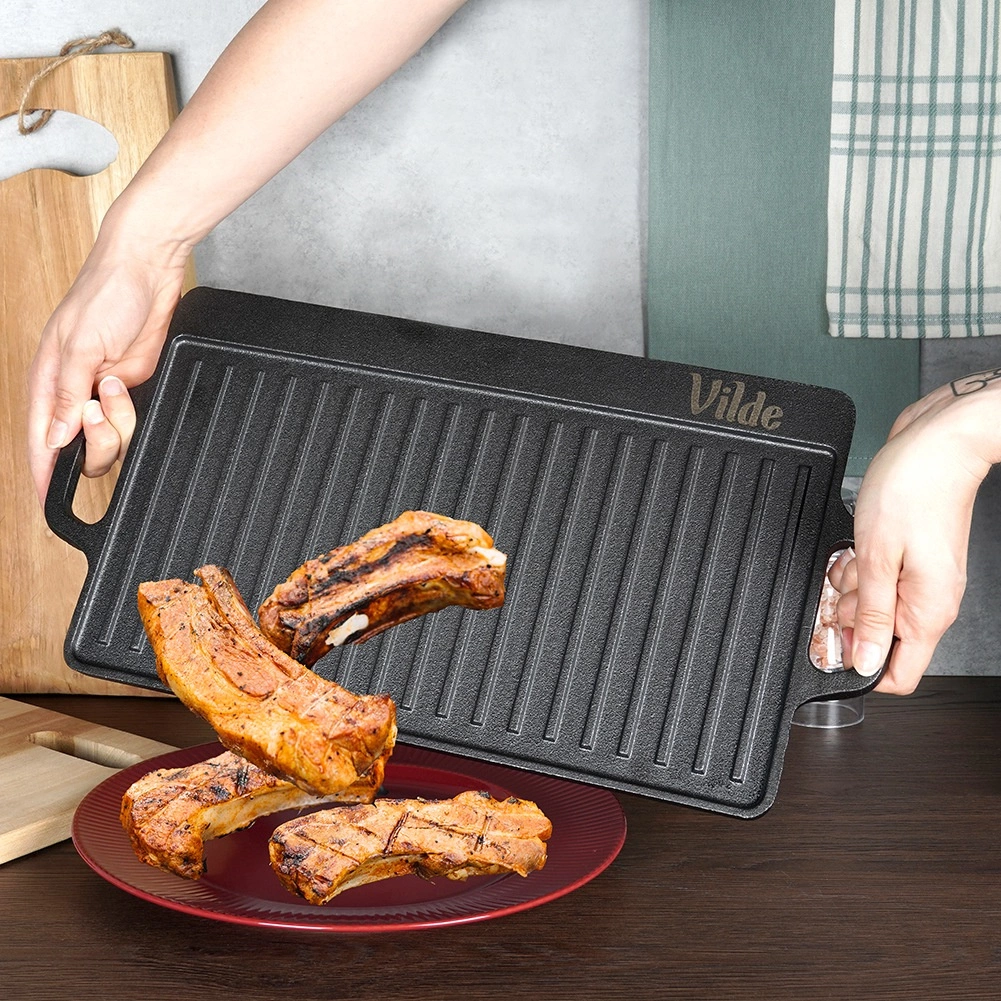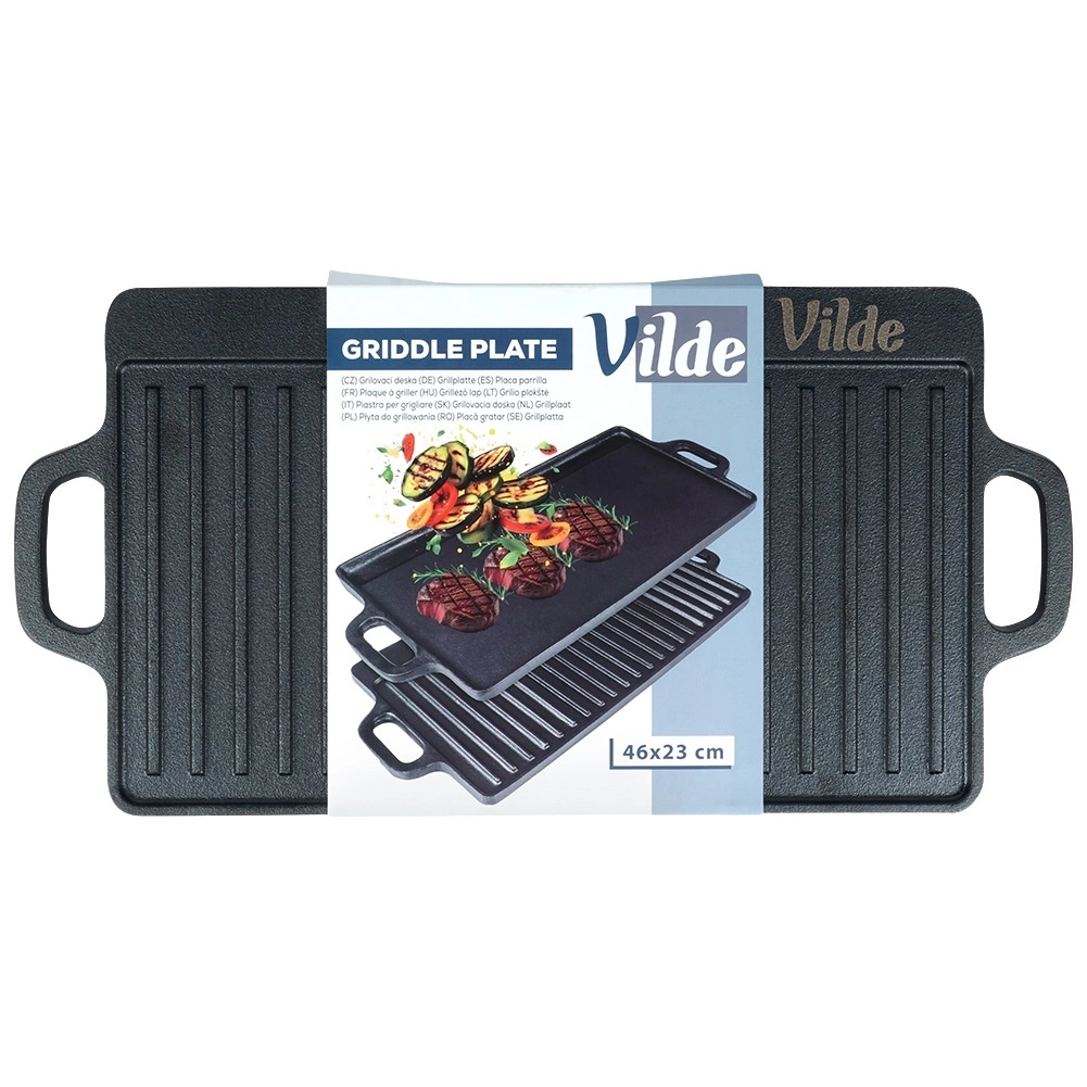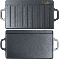 Plaque de cuisson en fonte réversible VILDE CAST LINE, dimensions 45,5 × 22,5 cm, offrant une surface lisse et une surface strillée pour une cuisson polyvalente. La fonte se chauffe uniformément, retient parfaitement la chaleur et convient à la cuisinière, au four et au gril.