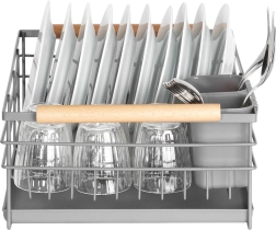 L’égouttoir dispose de logements pour 10 assiettes ainsi que d’un espace pour verres et bols. Les poignées latérales en bois facilitent le transport et confèrent au produit un style qui s’accorde avec différents intérieurs. Un entretien facile et des matériaux durables en font un allié fiable pour la vaisselle de tous les jours.