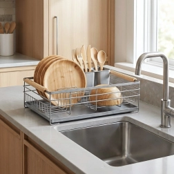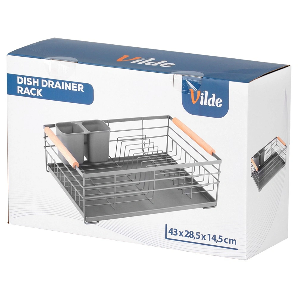 Pratique égouttoir à vaisselle gris de 43 × 28,5 × 14,5 cm qui apporte ordre et sécheresse au plan de travail. Il offre un plateau d’égouttage amovible, un panier à couverts à deux compartiments et de la place pour jusqu’à 10 assiettes. Grâce à sa structure métallique robuste et à ses poignées en bois, il est stable, facile à transporter et s’intègre parfaitement aux cuisines modernes comme classiques.