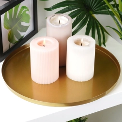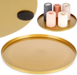 Élégant plateau rond de 30 cm de diamètre, idéal comme base stylée pour bougies, décorations ou bijoux. Grâce à sa structure en métal avec finition dorée mate, il est résistant, stable et facile à nettoyer. Des patins antidérapants et protecteurs au dessous protègent les meubles et le bord bas aide à tout maintenir en place en toute sécurité.