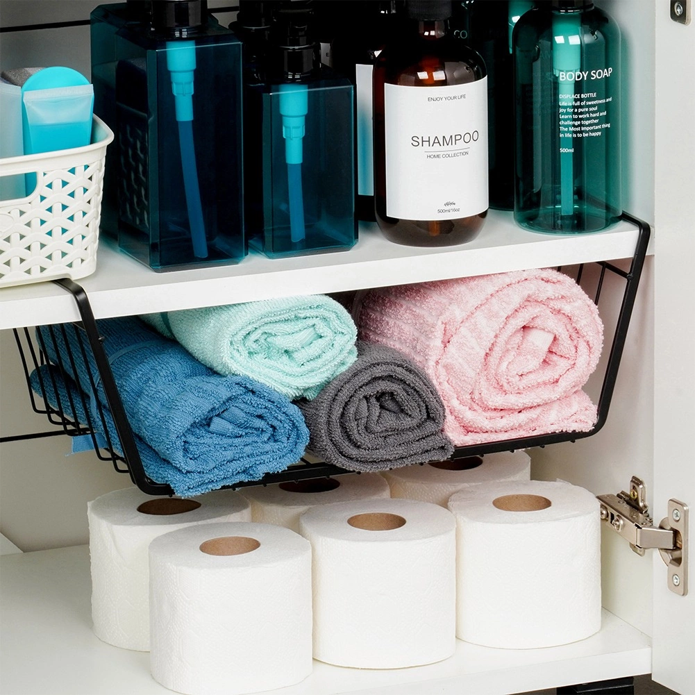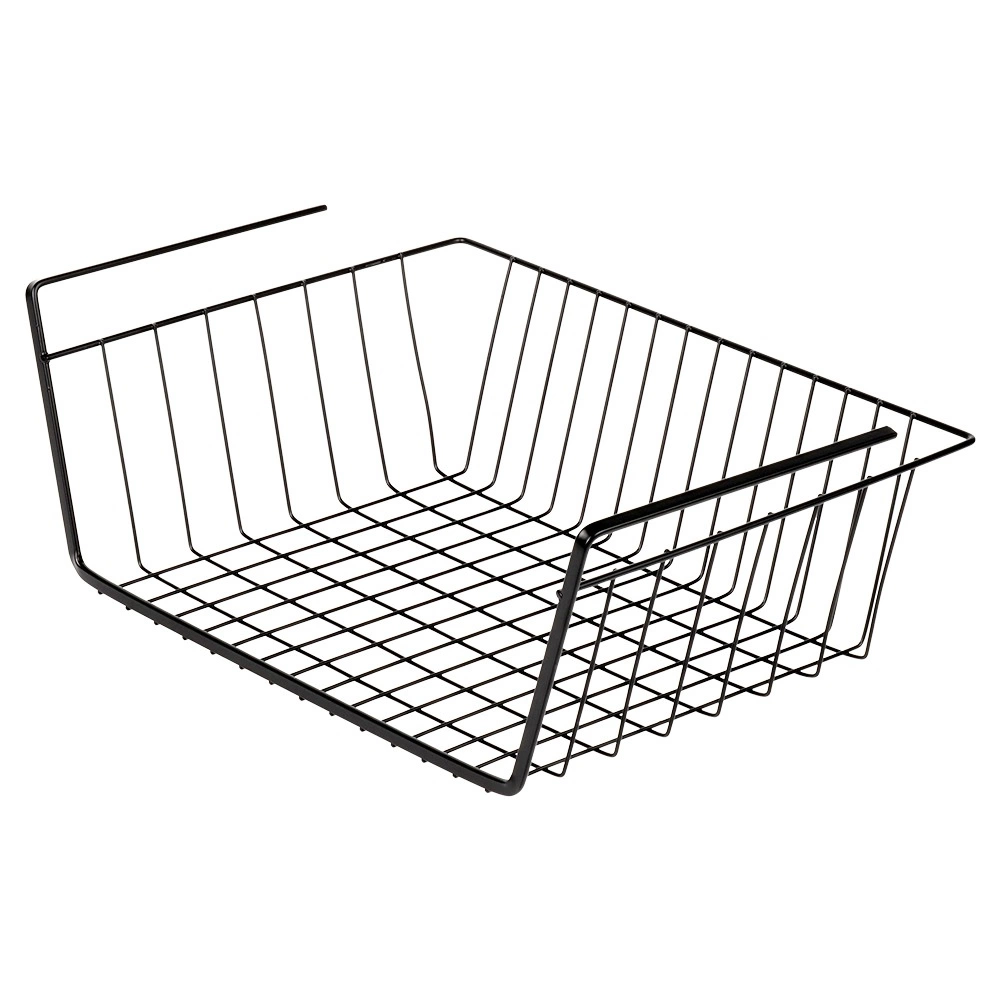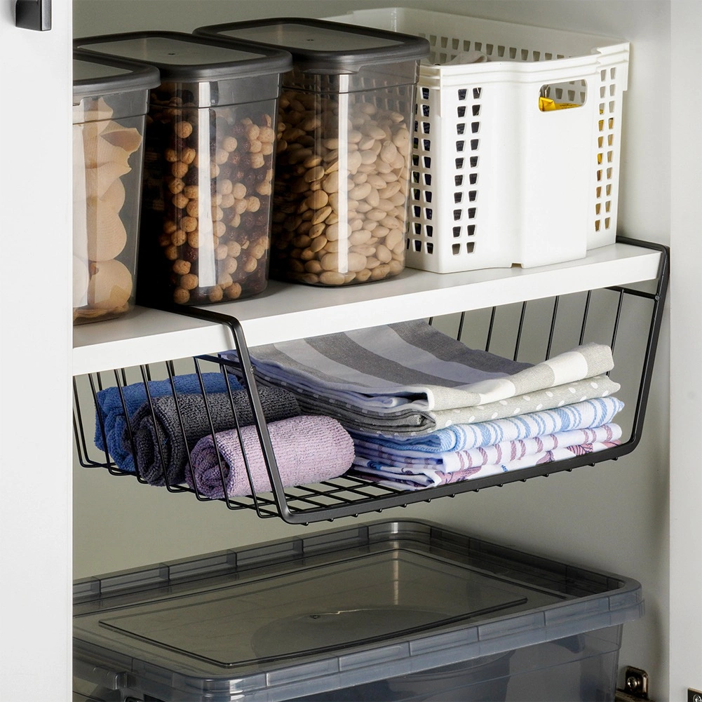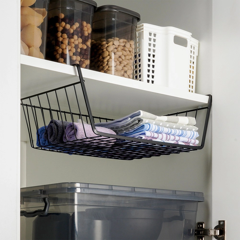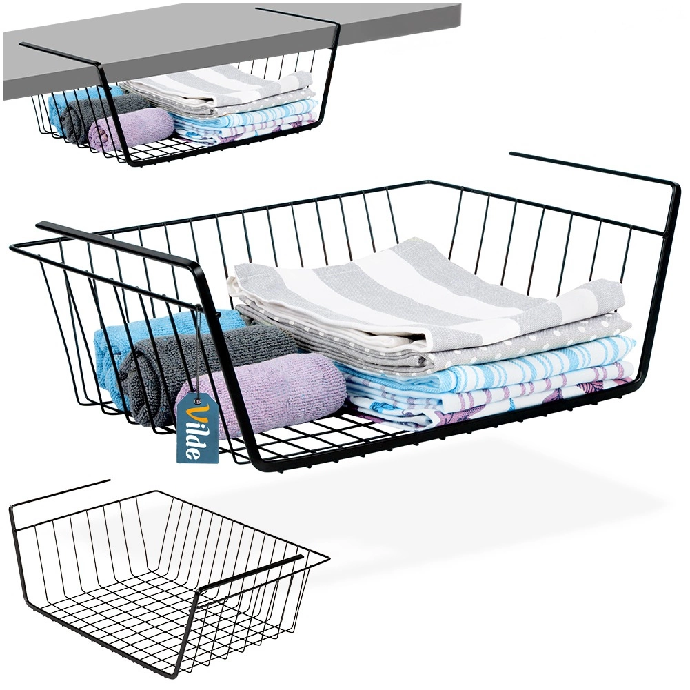 Pratique, le panier suspendu sous étagère en métal de qualité, coloris noir, augmente votre espace de rangement en un instant – sans perçage ni outils. Grâce à sa structure filaire ouverte, le contenu reste toujours visible et bénéficie d’une aération optimale. Idéal pour la cuisine, la salle de bain, le dressing et le bureau pour un rangement clair des serviettes, textiles ou accessoires de cuisine.
