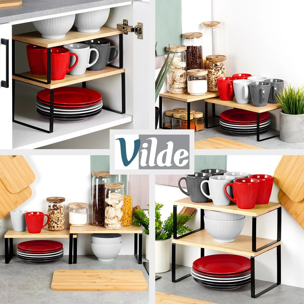 Le set comprend deux étagères universelles qui augmentent instantanément l’espace de rangement dans la cuisine, le garde-manger ou la salle de bain. Grande étagère : 33,5 × 19,5 × 16 cm, petite étagère : 33,5 × 18,5 × 13,5 cm. Côtes à côtes, elles offrent une longueur totale de 67 cm. Le plateau en bambou résistant et la structure métallique stable garantissent une longue durée de vie même en usage quotidien.