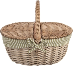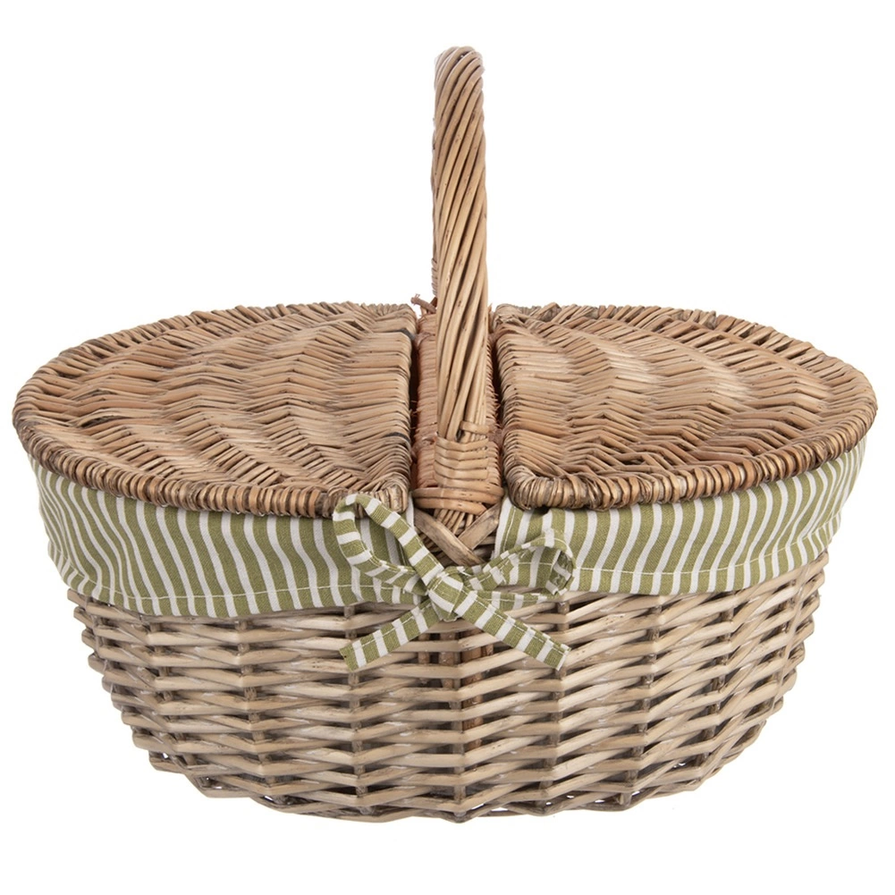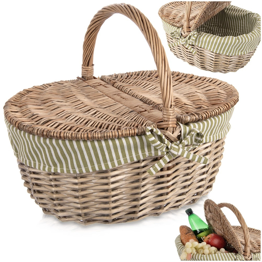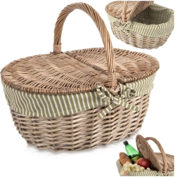 Élégant panier de pique-nique en osier avec couvercle ouvrable des deux côtés et anse solide, idéal pour les excursions comme pour le parc. Il possède une doublure textile amovible à rayures vert et blanc, lavable, et offre une fabrication artisanale robuste en saule naturel, un espace généreux pour les rafraîchissements et une utilisation polyvalente – du pique-nique aux courses en passant par la cueillette des champignons.