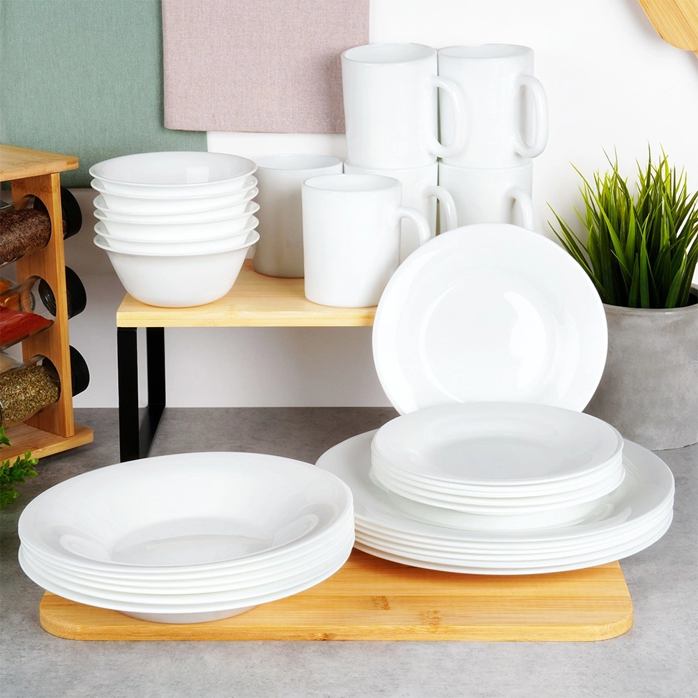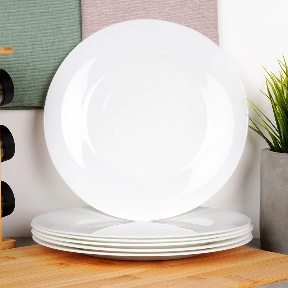 Élégant set de 6 assiettes plates de 25,5 cm de diamètre en verre opale résistant, de couleur blanche. Idéal pour le quotidien comme pour les tables de fête. Les assiettes sont légères, résistantes à la chaleur jusqu’à +100 °C, compatibles lave-vaisselle et micro-ondes. Le design minimaliste se marie parfaitement avec tout dressage de table.