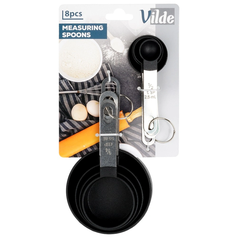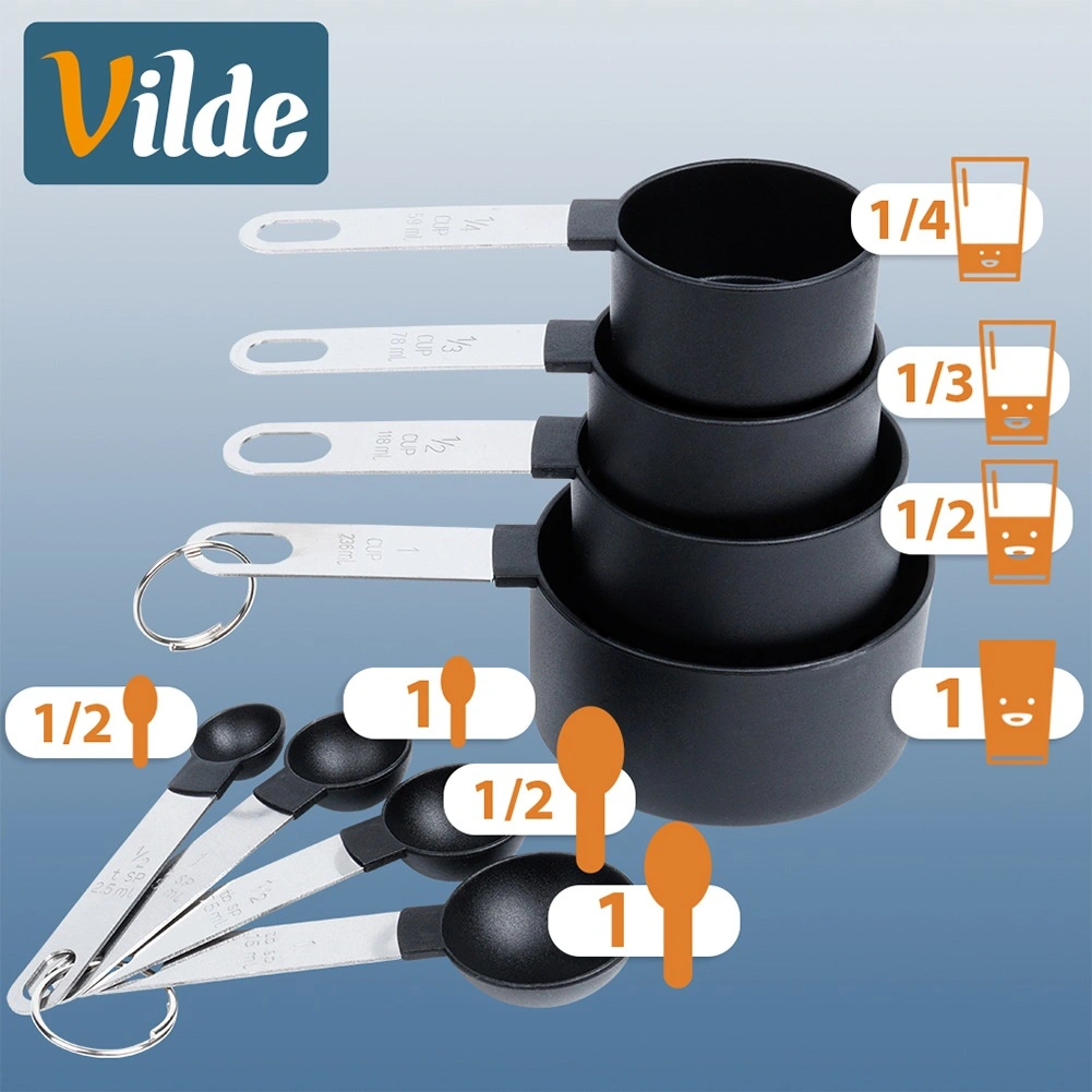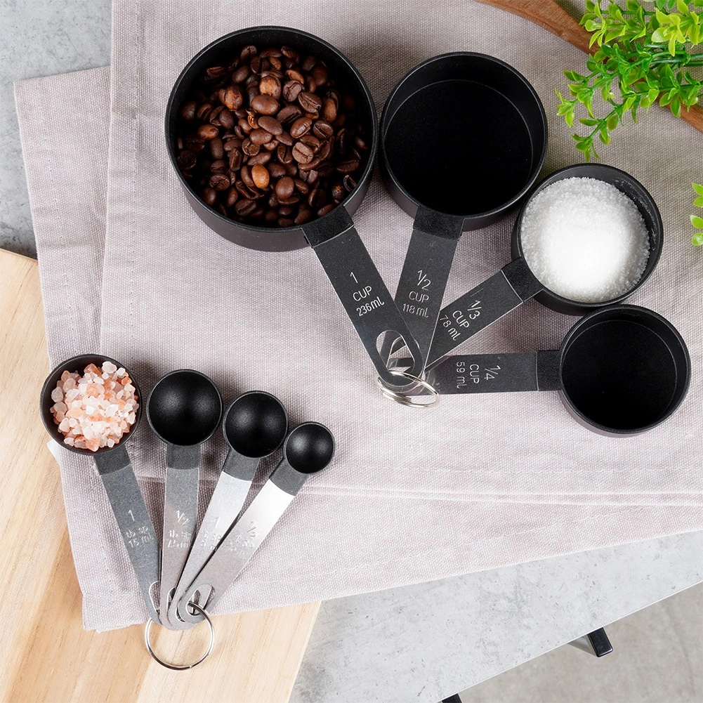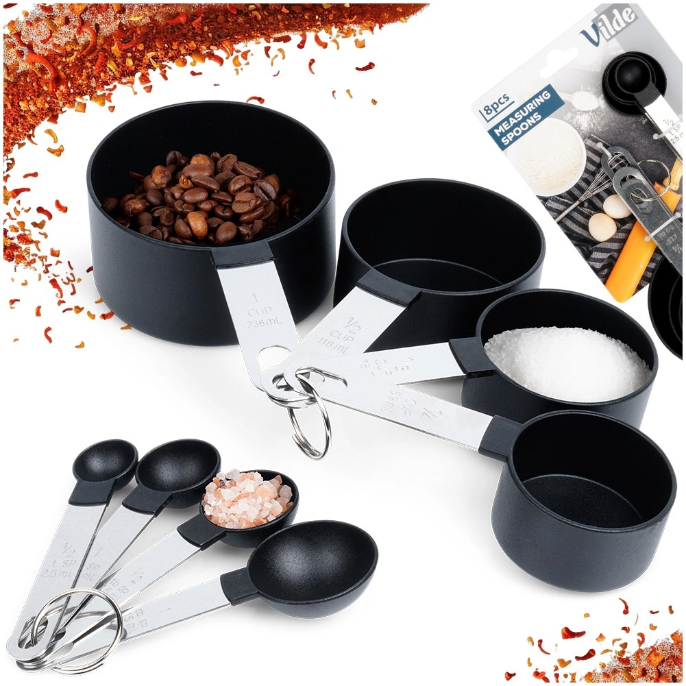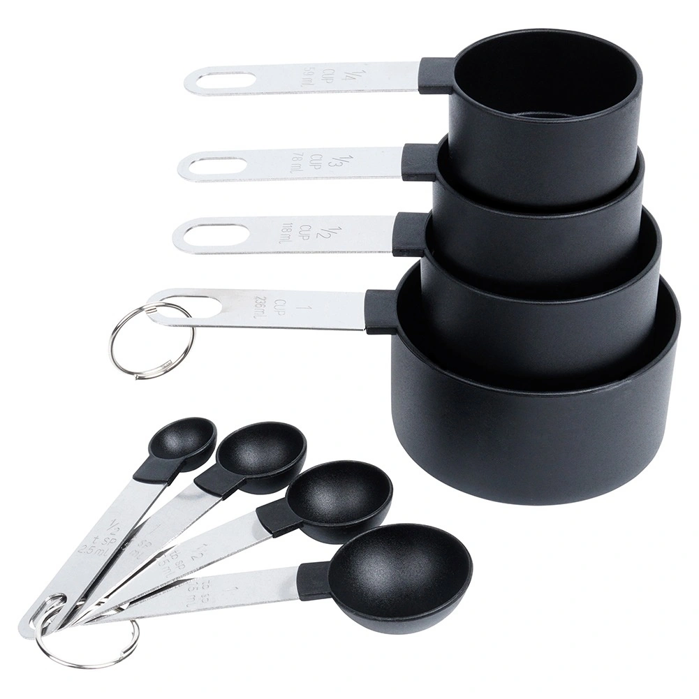 Les mesures disposent de poignées robustes en acier inoxydable et de bols en plastique de qualité dans une élégante couleur noire. Elles sont compatibles lave-vaisselle. Toutes les pièces sont reliées par un anneau métallique pour un accrochage facile et un rangement compact dans un tiroir.