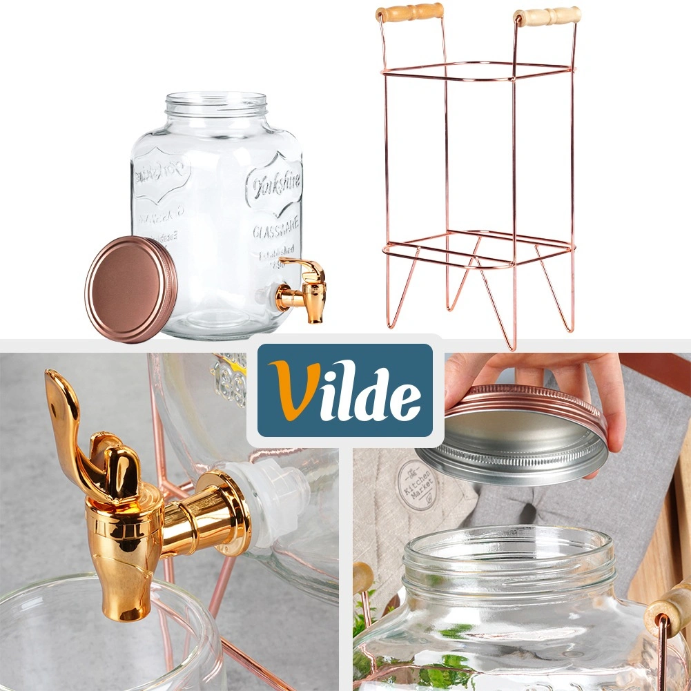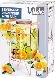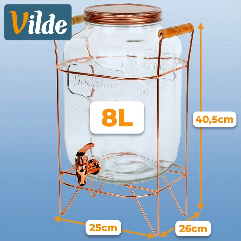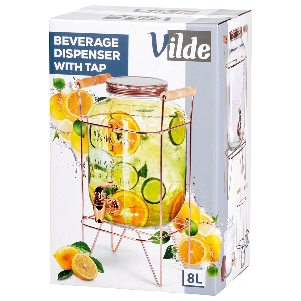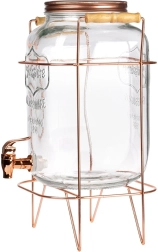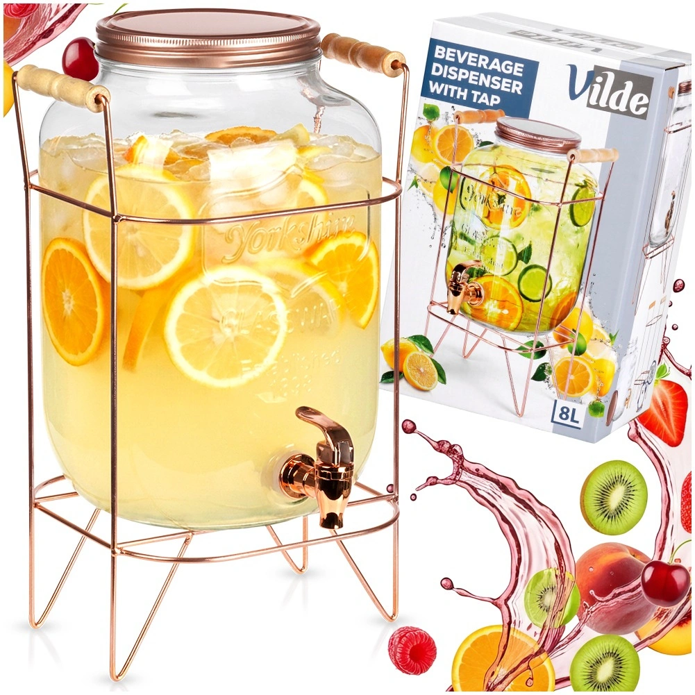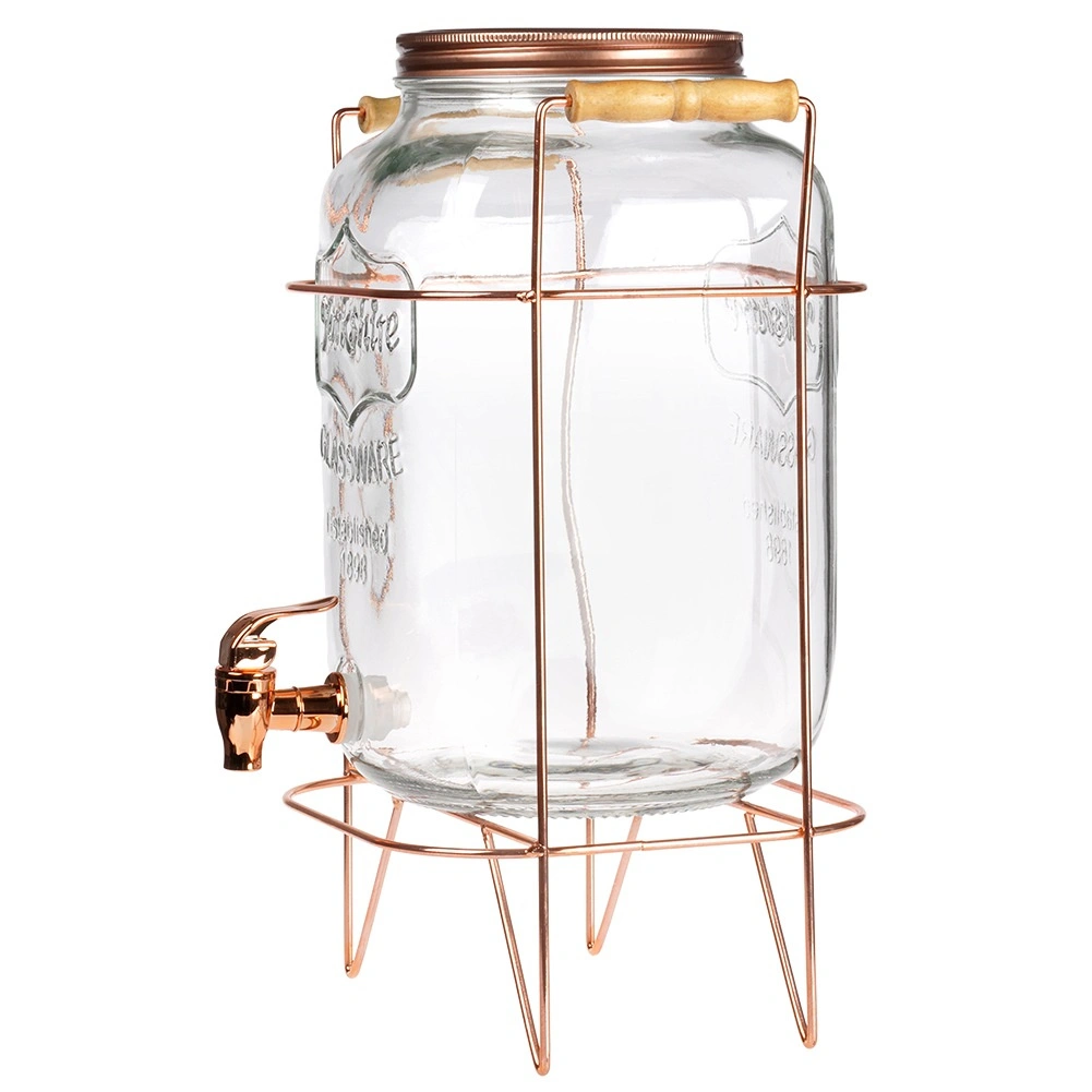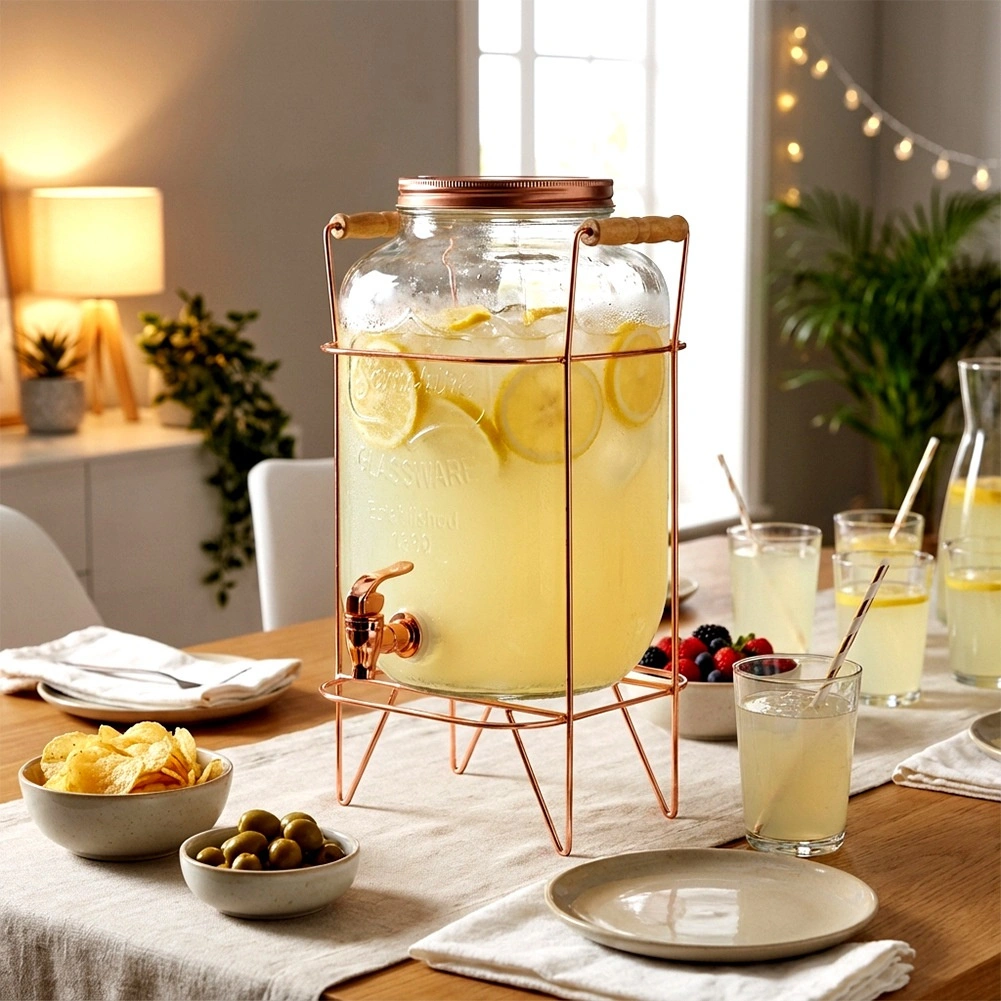 Distributeur de boissons élégant en verre d’une capacité de 8 l avec support métallique stable coloris or rose, idéal pour servir limonades, punchs ou thés glacés. Grâce au large goulot, vous remplissez facilement la boisson avec des fruits et des glaçons ; le robinet pratique assure un service aisé et le couvercle à vis protège le contenu de la poussière et des insectes. Verre robuste, design élégant et poignées en bois confortables sur le support font de ce distributeur un choix parfait pour les fêtes au jardin comme à la maison.