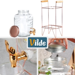 Le set comprend un bocal/distributeur en verre, un support métallique et un couvercle métallique à vis coloris or rose. Convient à l’eau, limonades maison, eaux aromatisées, jus, thés glacés et punchs. Idéal pour le jardin, la terrasse ou l’intérieur.