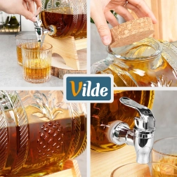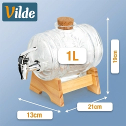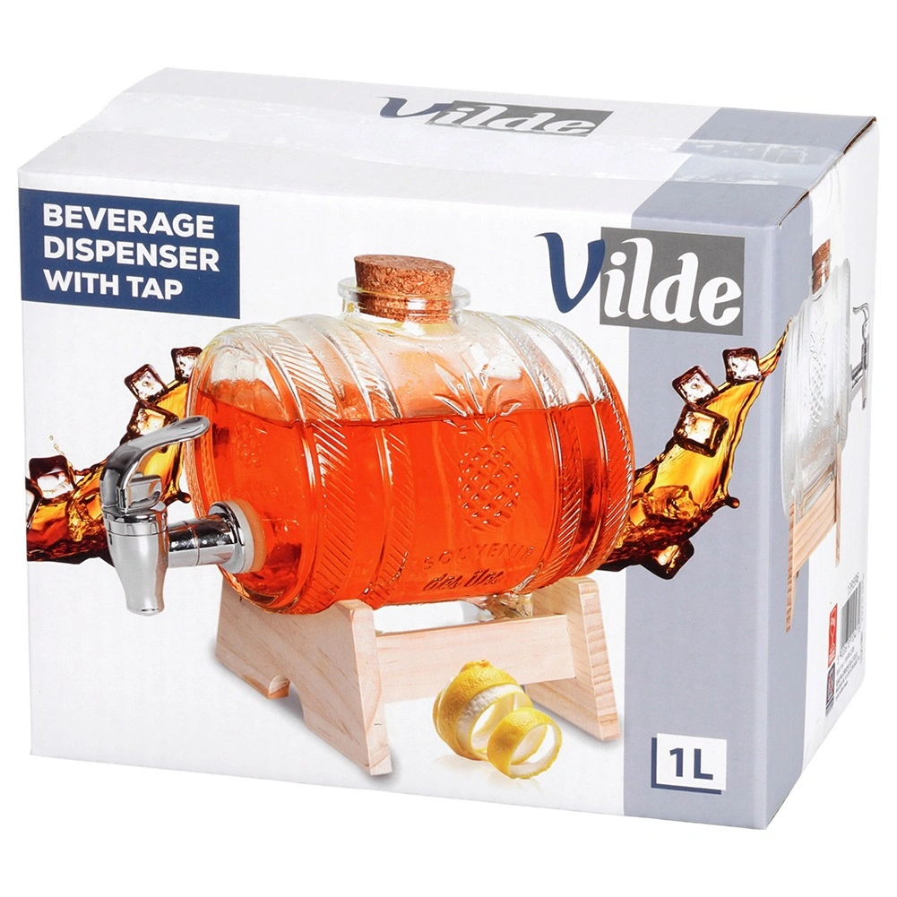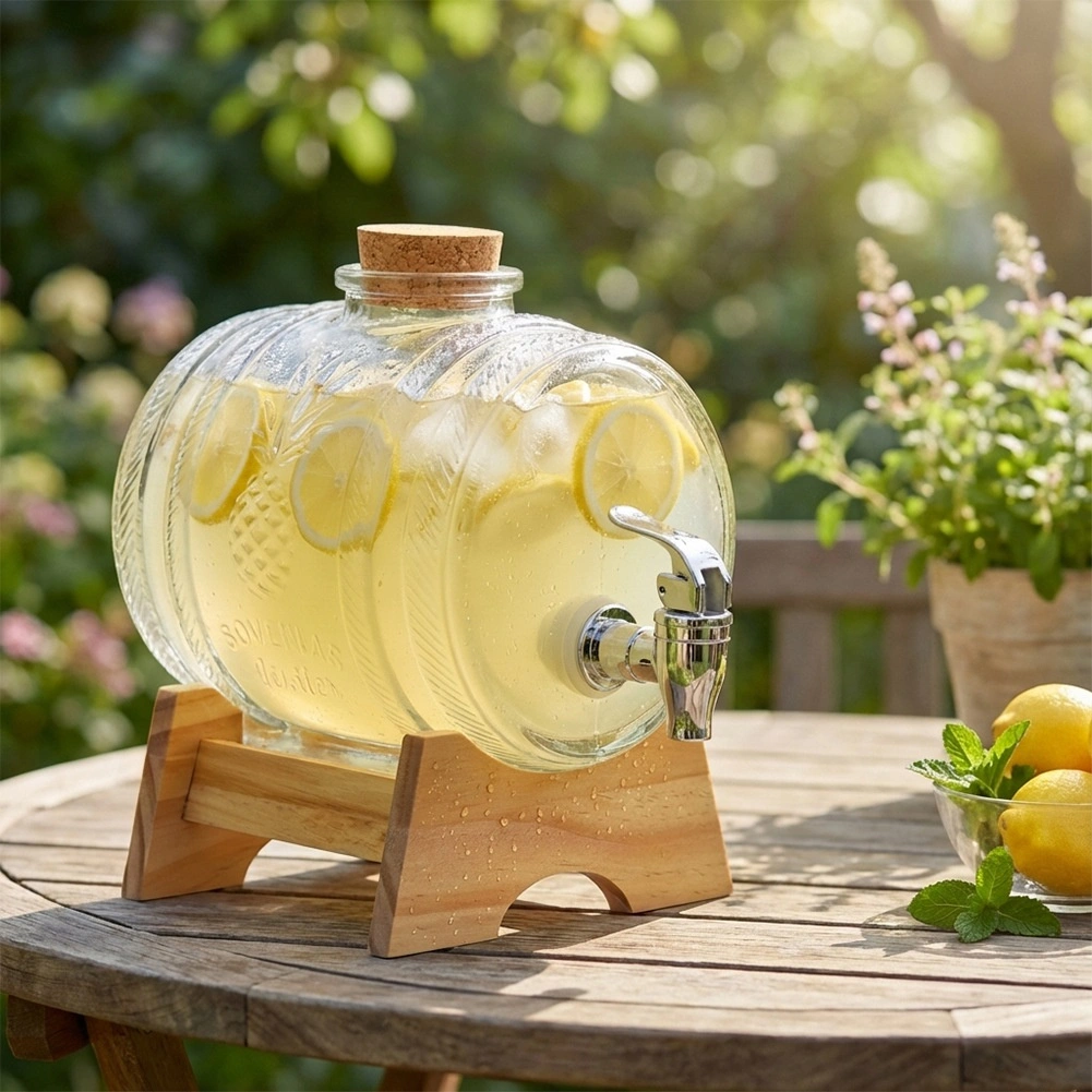La capacité de 1 l est idéale pour les limonades, jus, thé glacé, eau aromatisée, mais aussi pour les vins maison et liqueurs. Le support en bois offre la bonne hauteur pour remplir confortablement les verres, et le robinet métallique avec joint assure un écoulement fluide sans gouttes. Non adapté aux boissons chaudes.