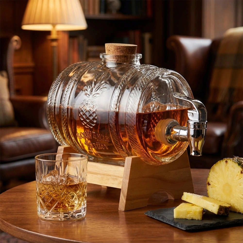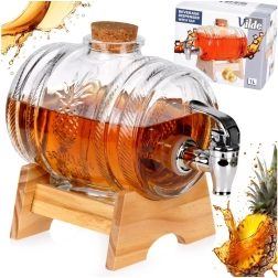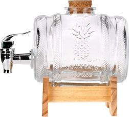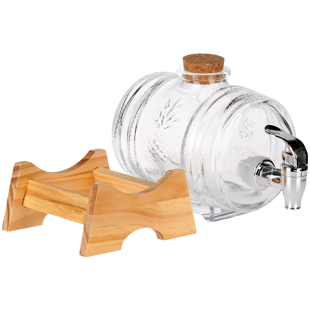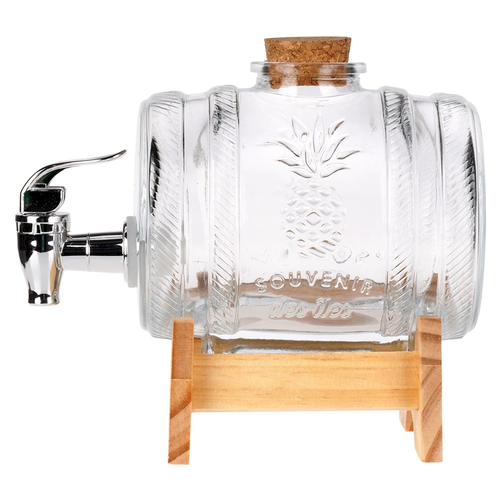 Élégant distributeur de boissons en verre de 1 l avec support en bois et robinet métallique, idéal pour servir limonades, jus, vins maison et liqueurs. Grâce à sa forme de tonneau, son motif en relief ananas et son bouchon en liège naturel, il attire le regard sur toute table. Le support stable assure un service confortable et le robinet pratique avec joint facilite l’utilisation.