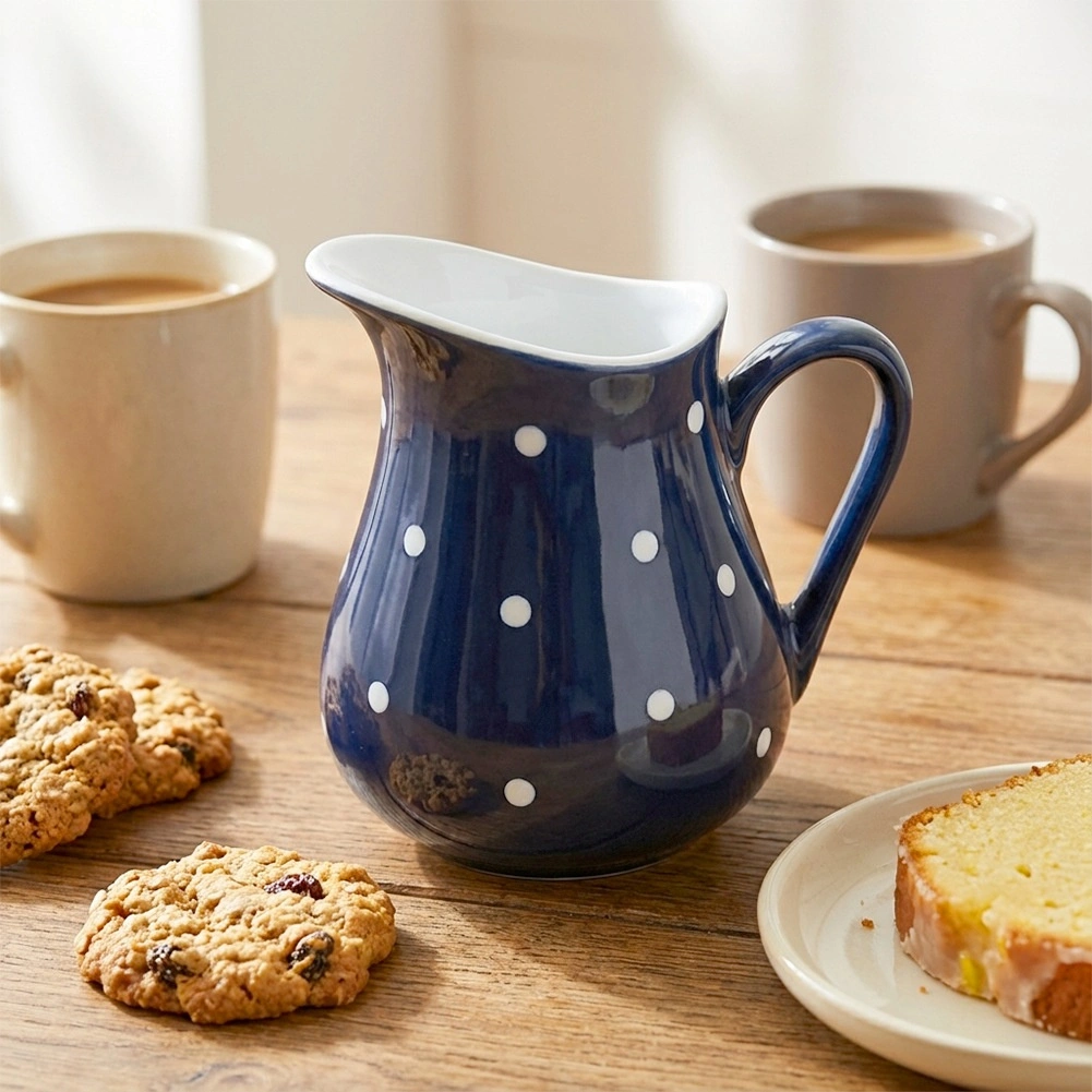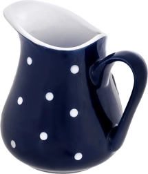 Élégante petite carafe en céramique d’une capacité de 480 ml en bleu foncé à pois blancs, idéale pour servir le lait, la crème, les boissons et les sauces. Elle possède une anse ergonomique et un bec verseur profilé pour un service précis sans éclaboussures, compatible lave-vaisselle et micro-ondes, et complète parfaitement toute table.