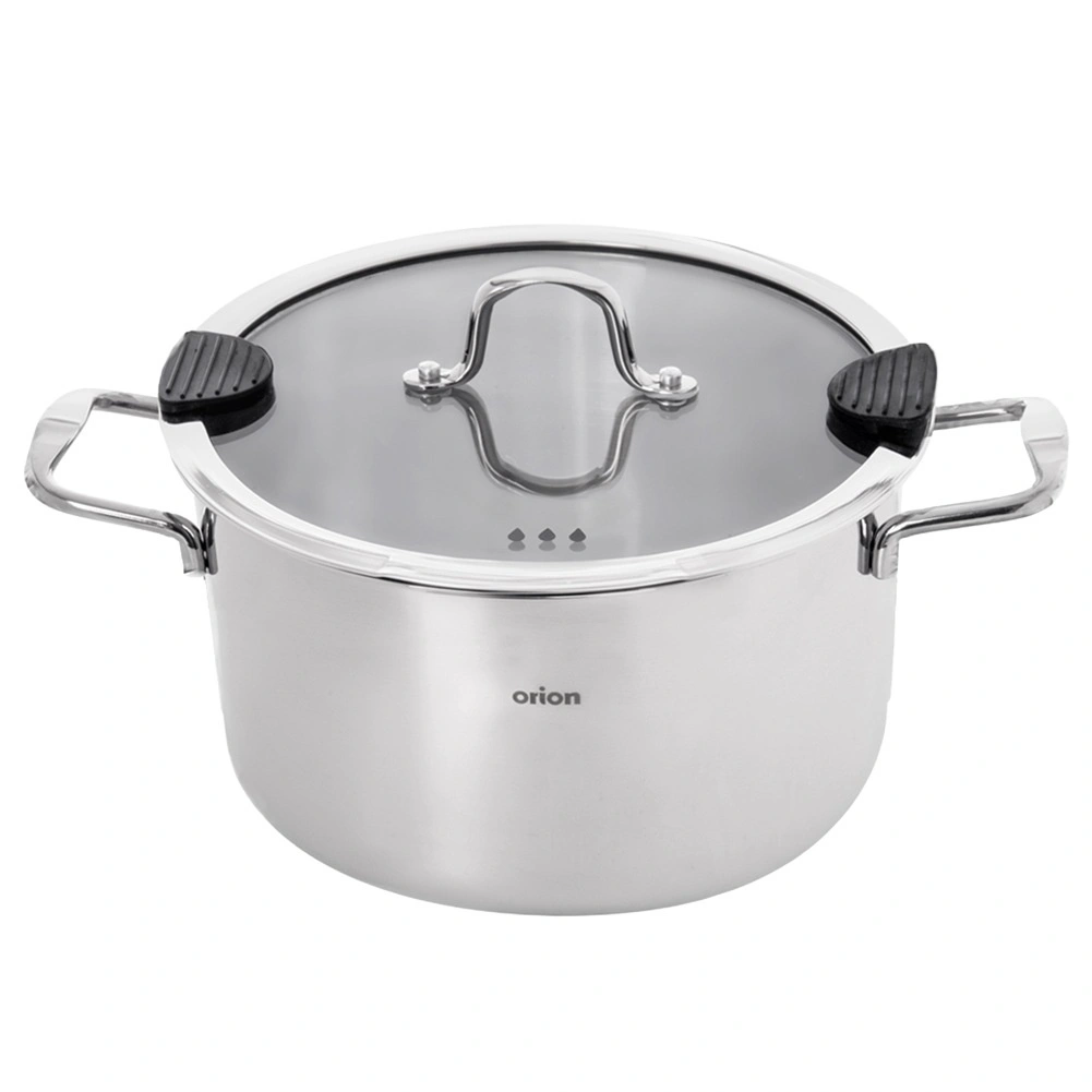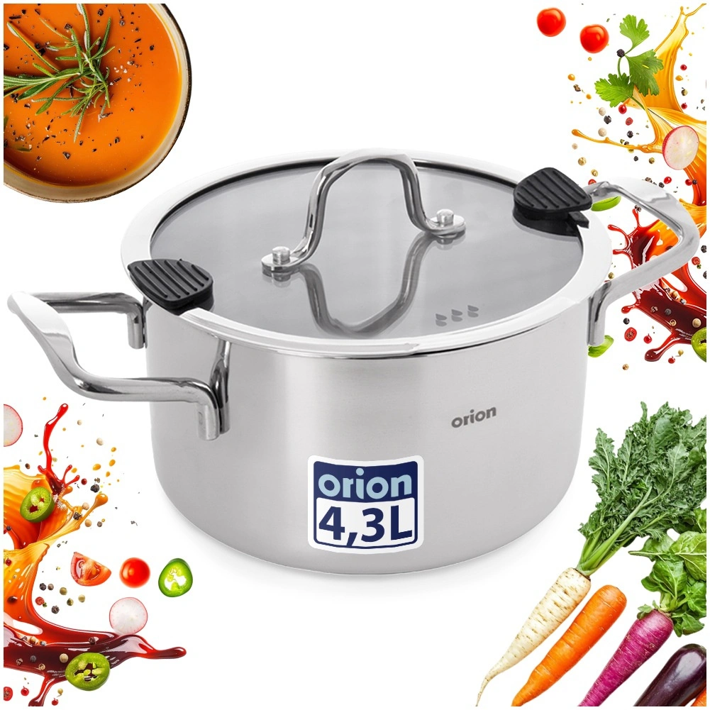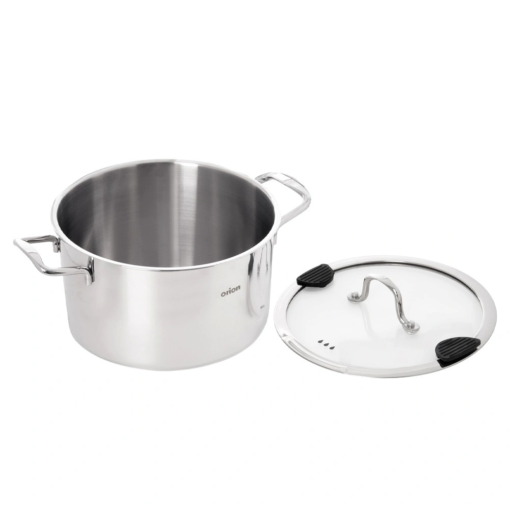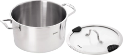 Casserole universelle en inox 22 cm, 4,3 l pour la cuisine quotidienne : cuisson, mijotage et rôtissage. Acier inoxydable 304 durable, fond multicouche avec aluminium pour une chaleur uniforme et couvercle en verre avec bec verseur et éléments en silicone pour un égouttage facile. Compatible gaz, électricité, vitrocéramique et induction, au four jusqu’à 200 °C et au lave-vaisselle.