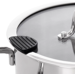 Des becs verseurs intégrés et des prises en silicone sur le bord du couvercle permettent d’évacuer la vapeur et d’égoutter l’eau en toute sécurité sans passoire.