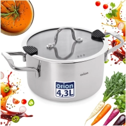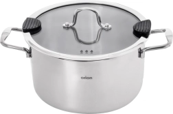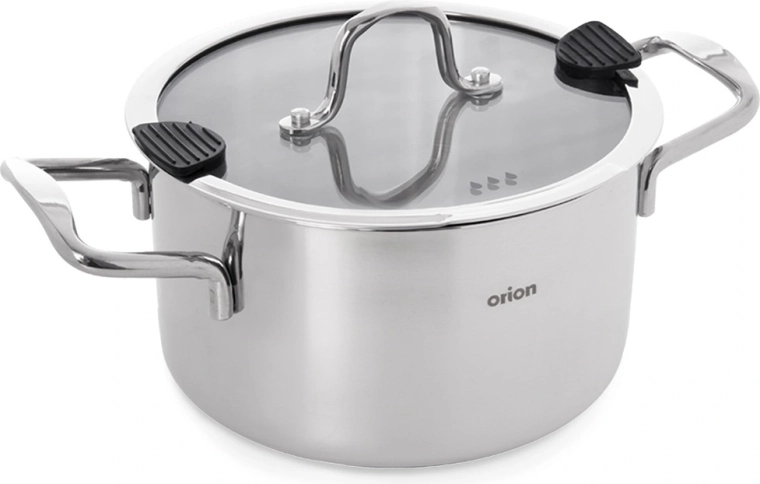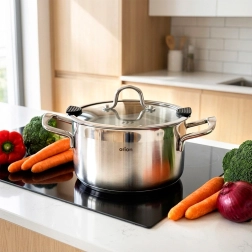 Casserole pratique et robuste en acier inoxydable 304 poli avec couvercle en verre, idéale pour les soupes, goulaschs, plats uniques et viandes rôties. Grâce au fond multicouche avec noyau en aluminium, la chaleur se répartit uniformément et accélère la cuisson. Le couvercle en verre avec bec verseur intégré et prises en silicone permet d’égoutter l’eau en toute sécurité sans passoire.