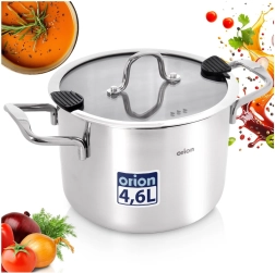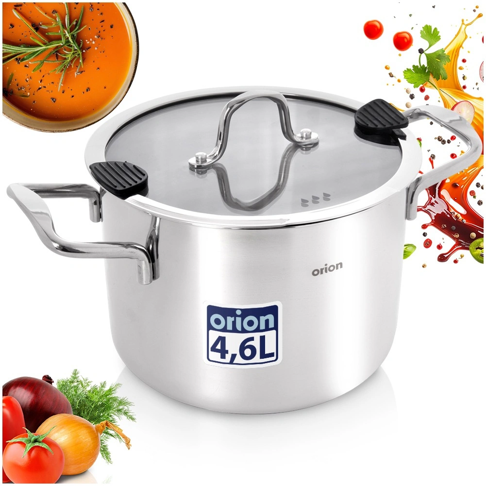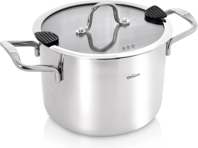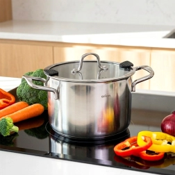 La casserole pratique VENICE en acier inoxydable d’une capacité de 4,6 l et d’un diamètre de 20 cm est idéale pour la cuisson quotidienne, le mijotage et la cuisson au four. Grâce à l’acier inoxydable 304, au couvercle en verre avec bec verseur et au fond multicouche avec aluminium, elle offre une chauffe uniforme, un égouttage confortable sans passoire et une longue durée de vie. Compatible avec gaz, électricité, vitrocéramique et induction et au four jusqu’à 200 °C.