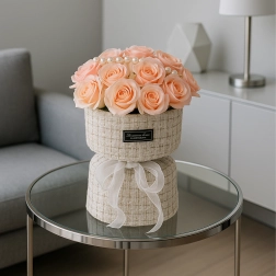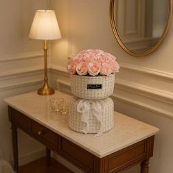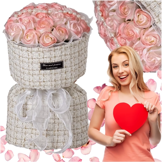 Ce set élégant de roses en savon roses dans une boîte à chapeau textile apporte une touche romantique à toute table, commode ou table basse. Les nuances douces de rose, rehaussées de perles et de lumières LED, créent un arrangement sophistiqué qui paraît frais tout en ne nécessitant aucun entretien.
