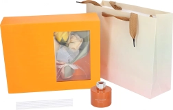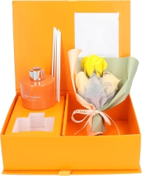 Ce coffret cadeau élégant est conçu pour séduire au premier regard et au premier souffle. Le diffuseur en verre avec tiges de rotin diffuse un agréable parfum d’orange, propice à une atmosphère apaisante dans la chambre, la salle de bains ou le bureau. Il est accompagné d’une boîte cadeau avec fenêtre et d’un joli bouquet décoratif de roses – prêt à être offert.