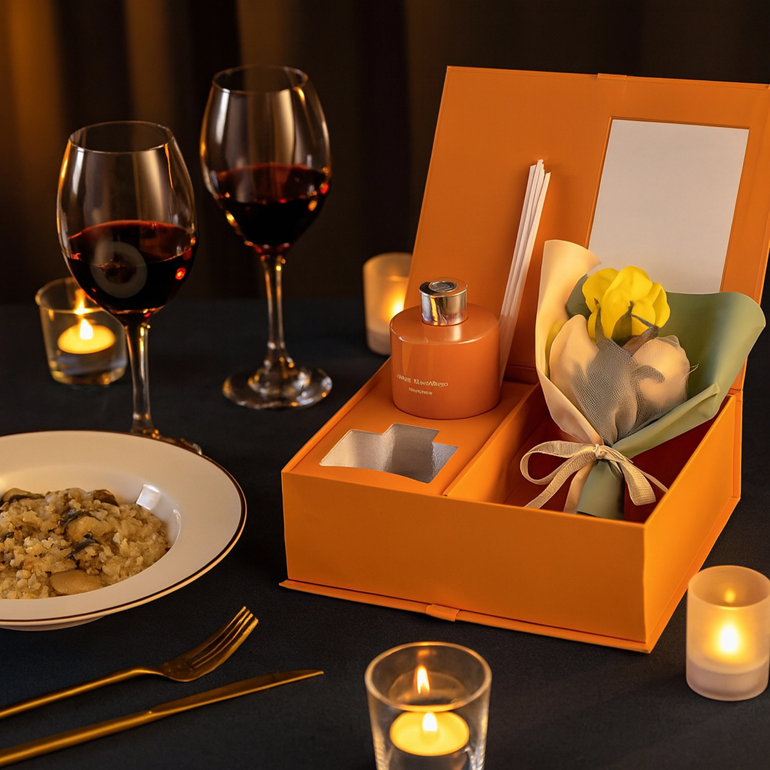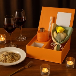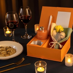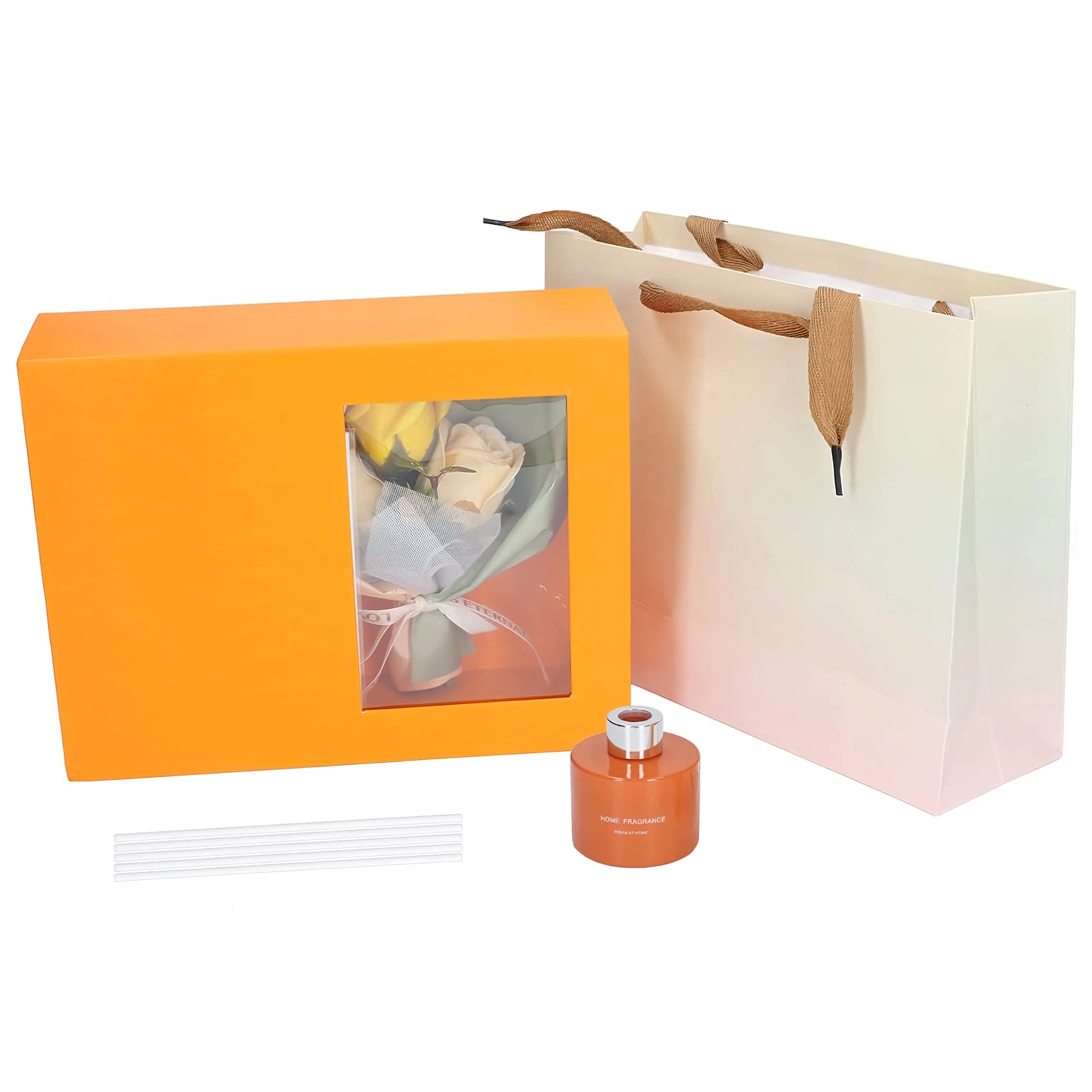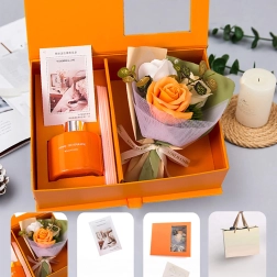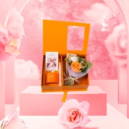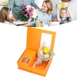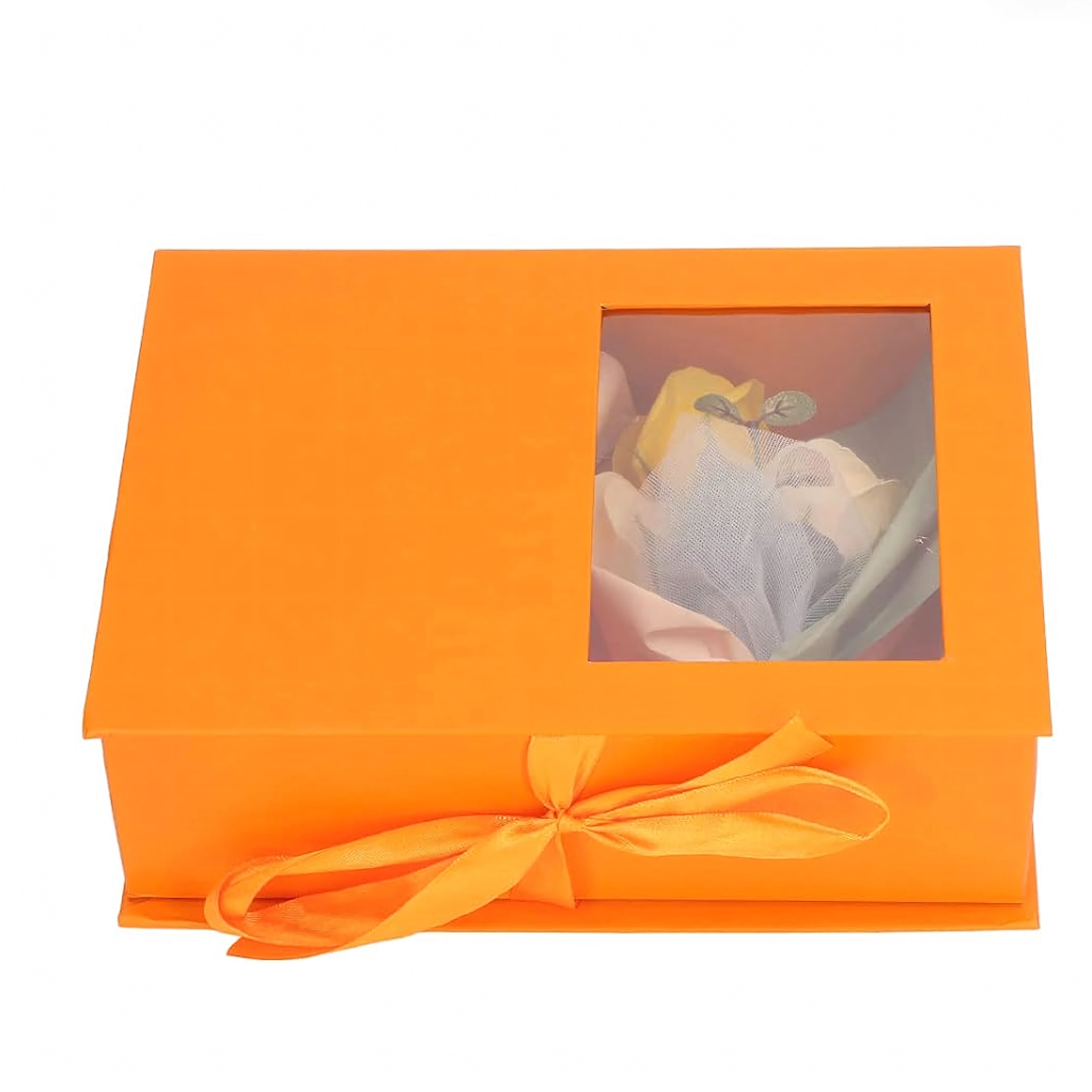 Une boîte orange rigide avec fenêtre et ruban, au rendu soigné ; elle inclut un petit bouquet de roses décoratives pour une présentation parfaitement assortie.