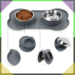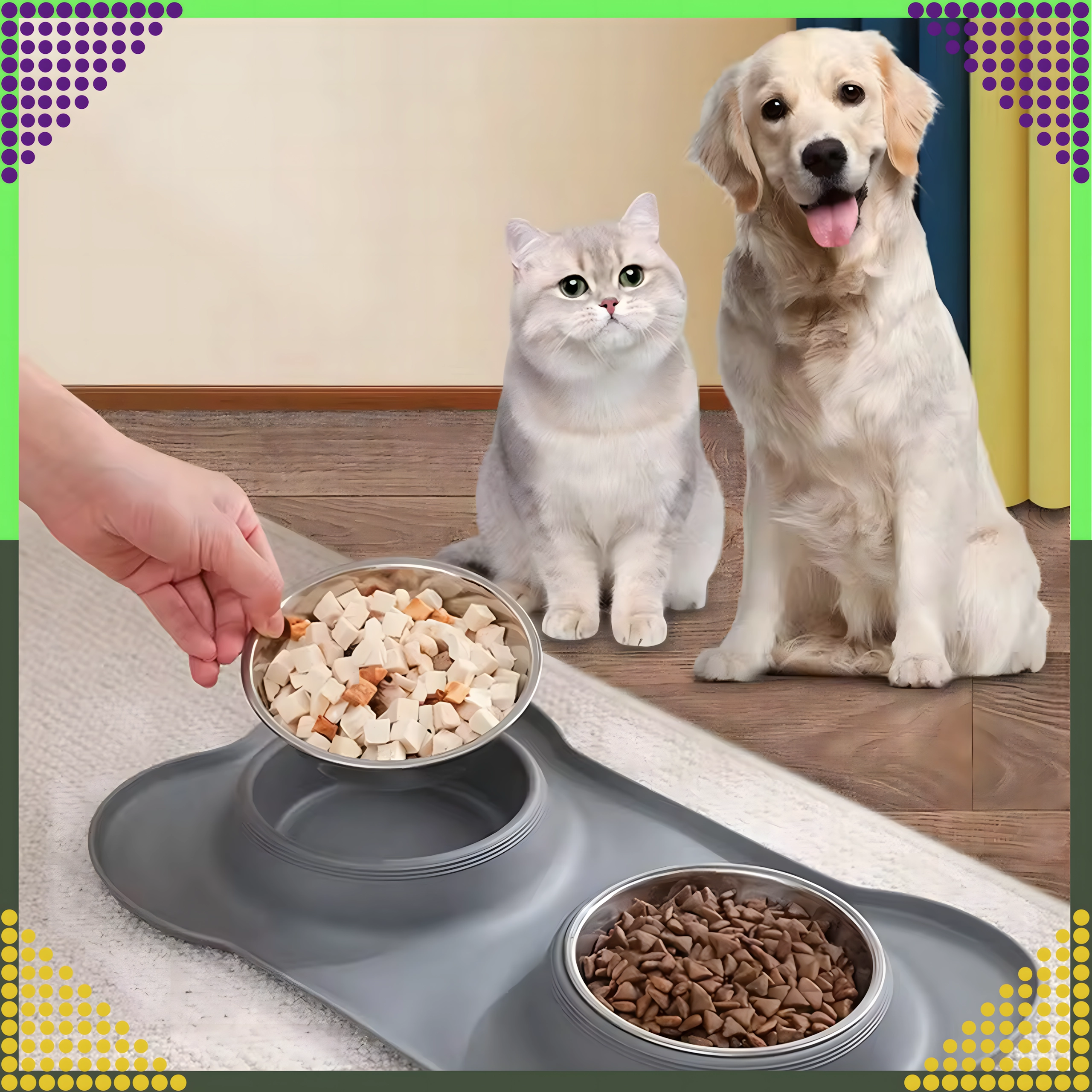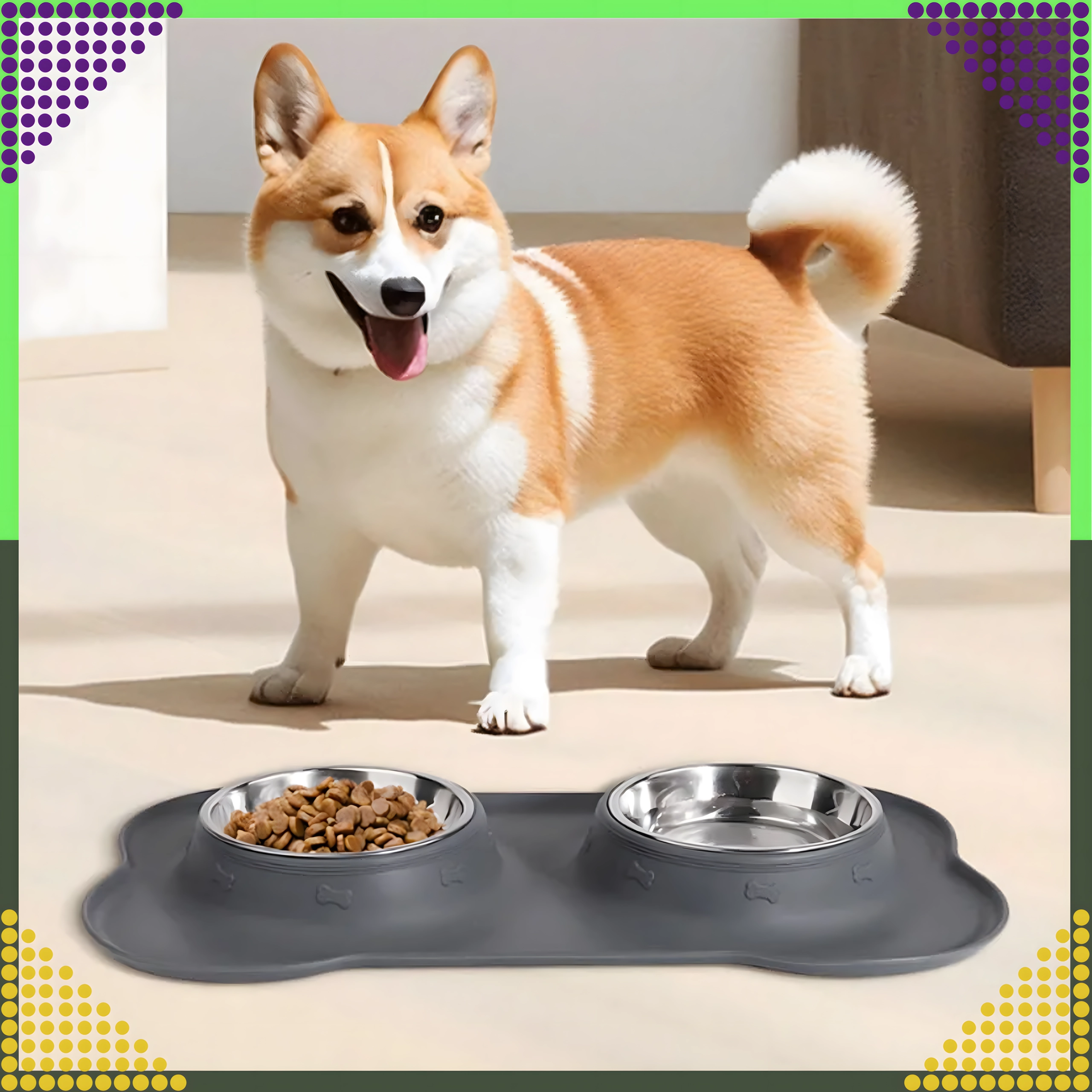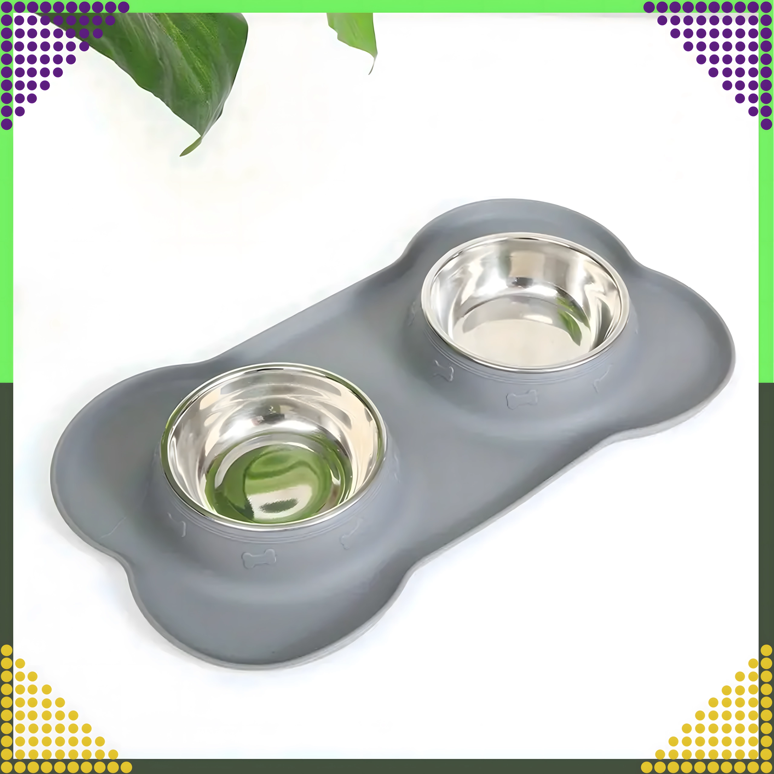 Pratique double gamelle pour chiens et chats d’une capacité de 2 × 450 ml, combinant deux bols amovibles en acier inoxydable et un tapis en silicone antidérapant en forme d’os. Le tapis aide à réduire les éclaboussures, maintient les bols en place et garde le sol propre et sec. Les bols sont compatibles lave-vaisselle et l’ensemble est facile à entretenir.