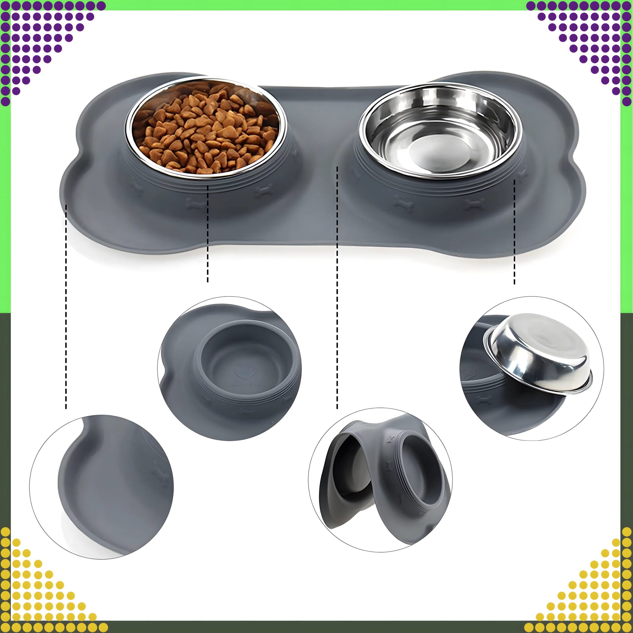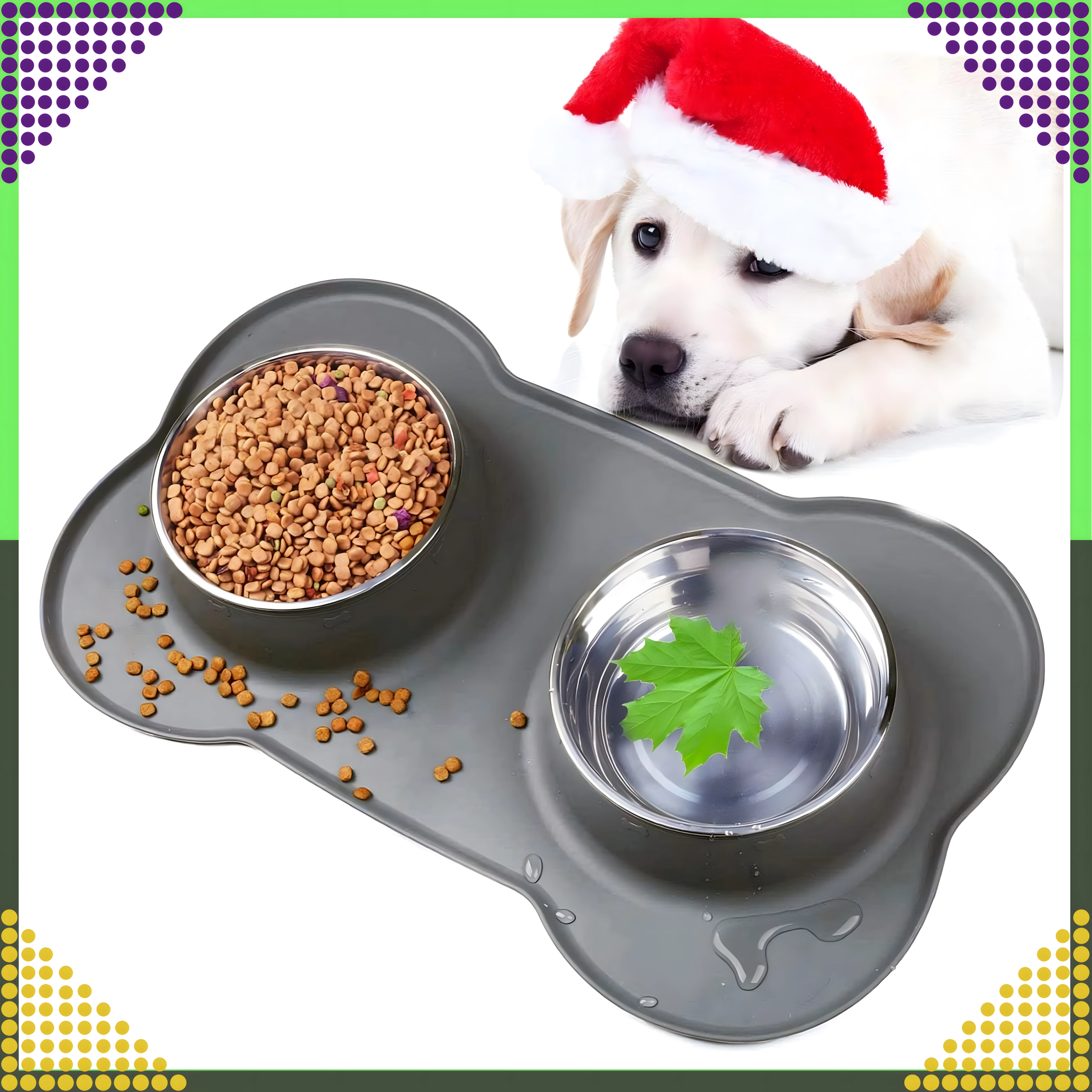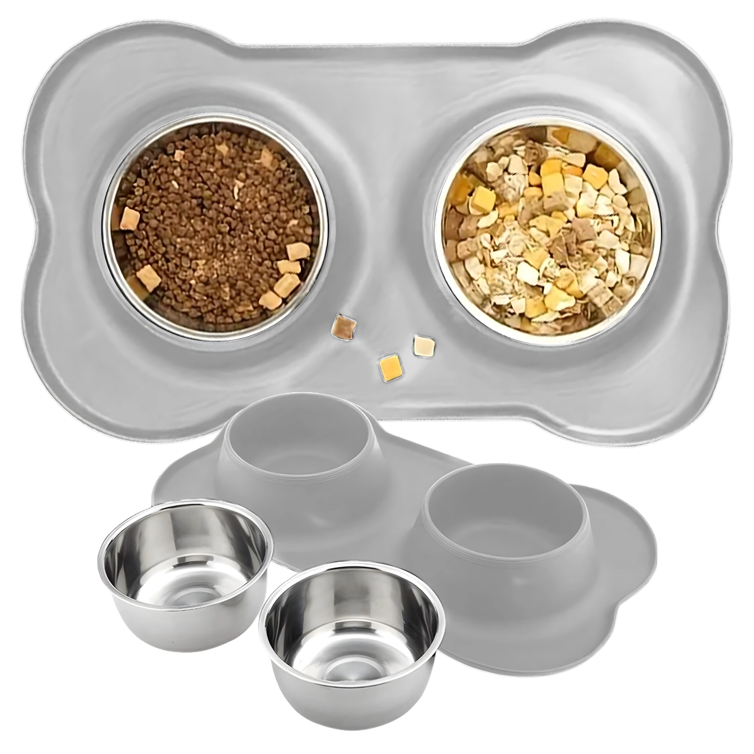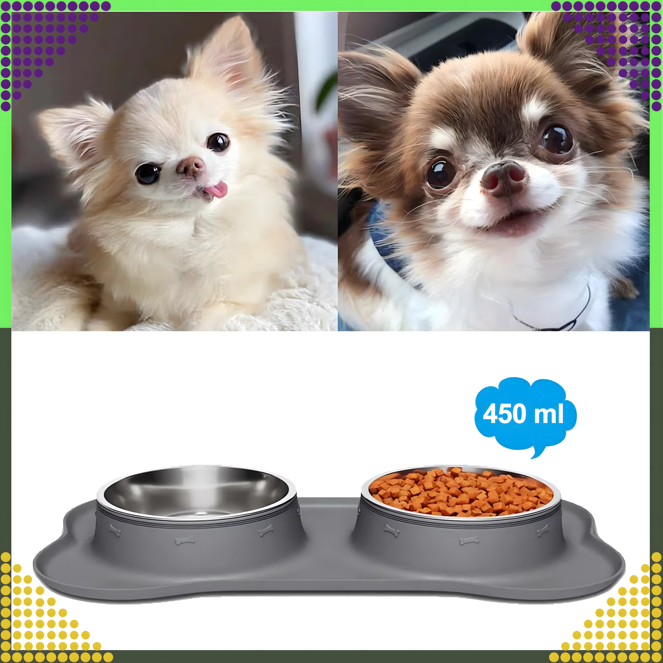 Double gamelle pour chiens et chats avec tapis en silicone antidérapant 2 × 450 ml, inox