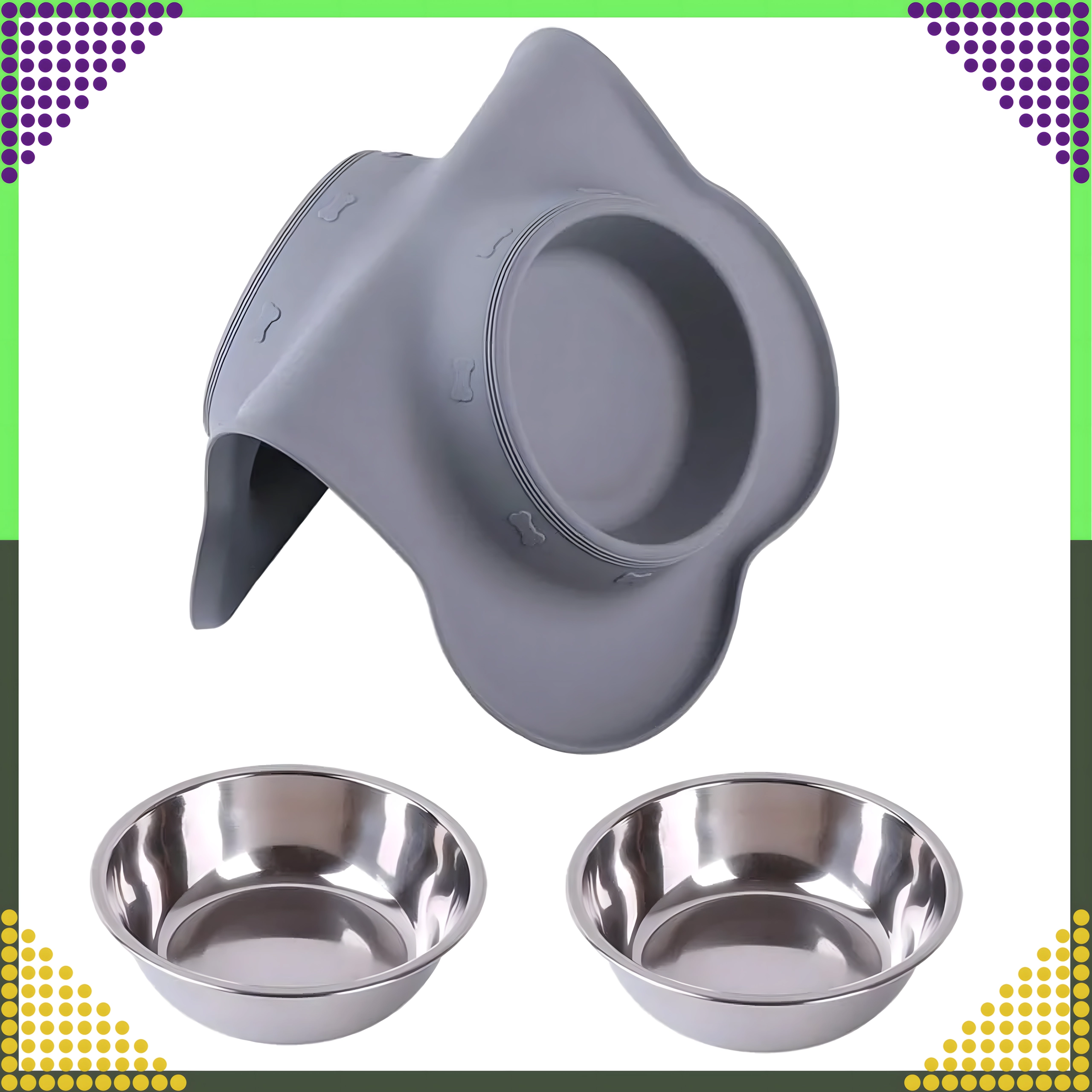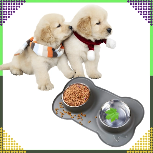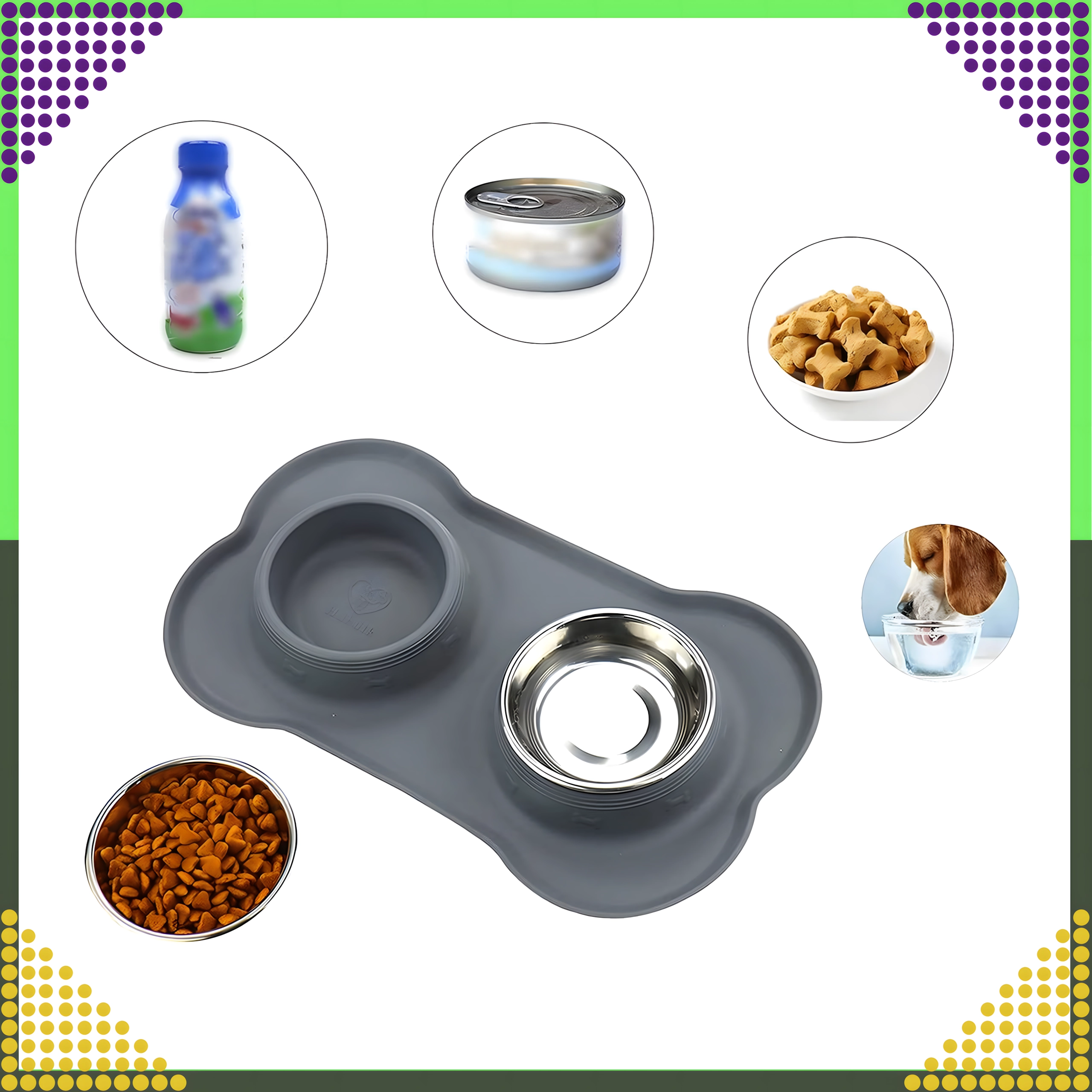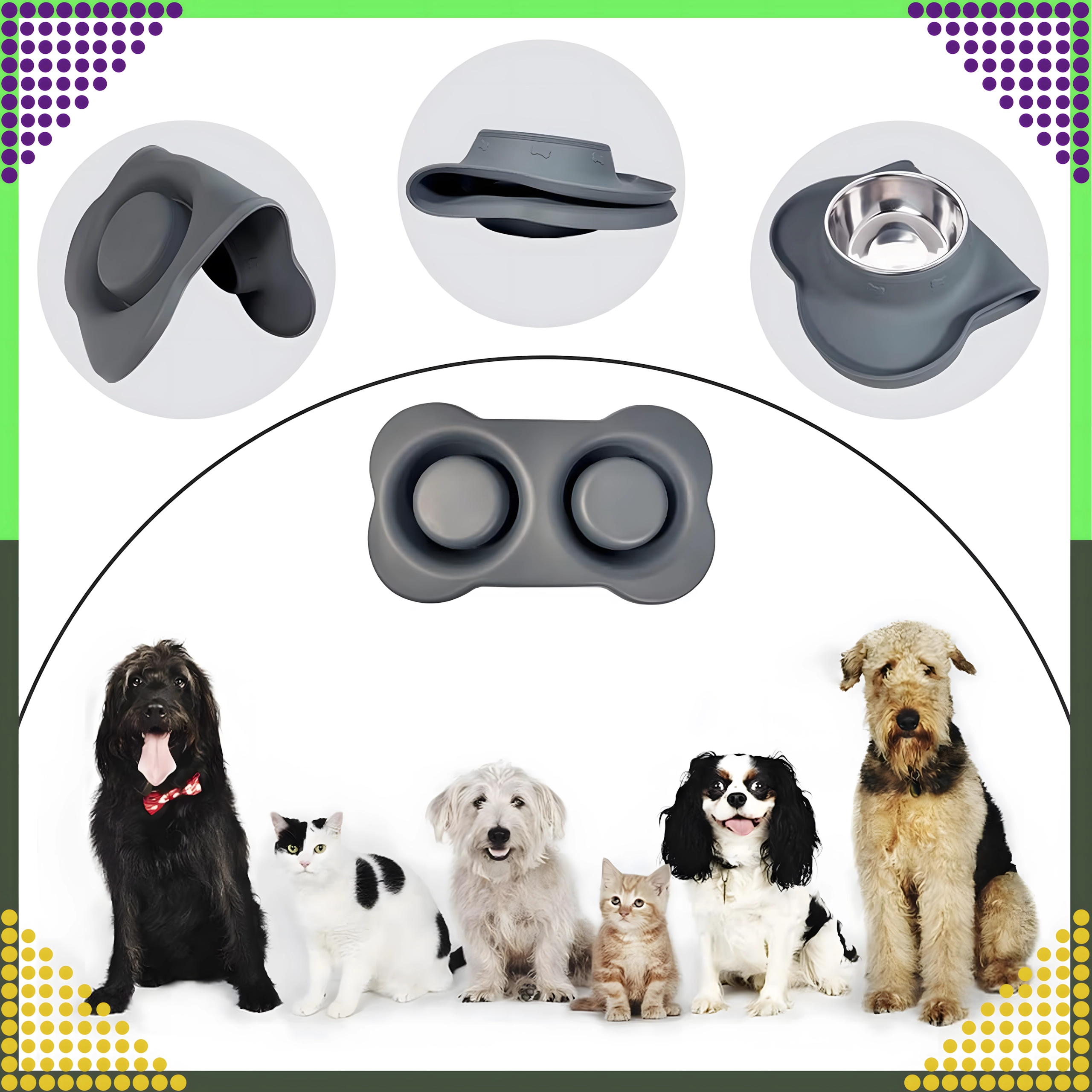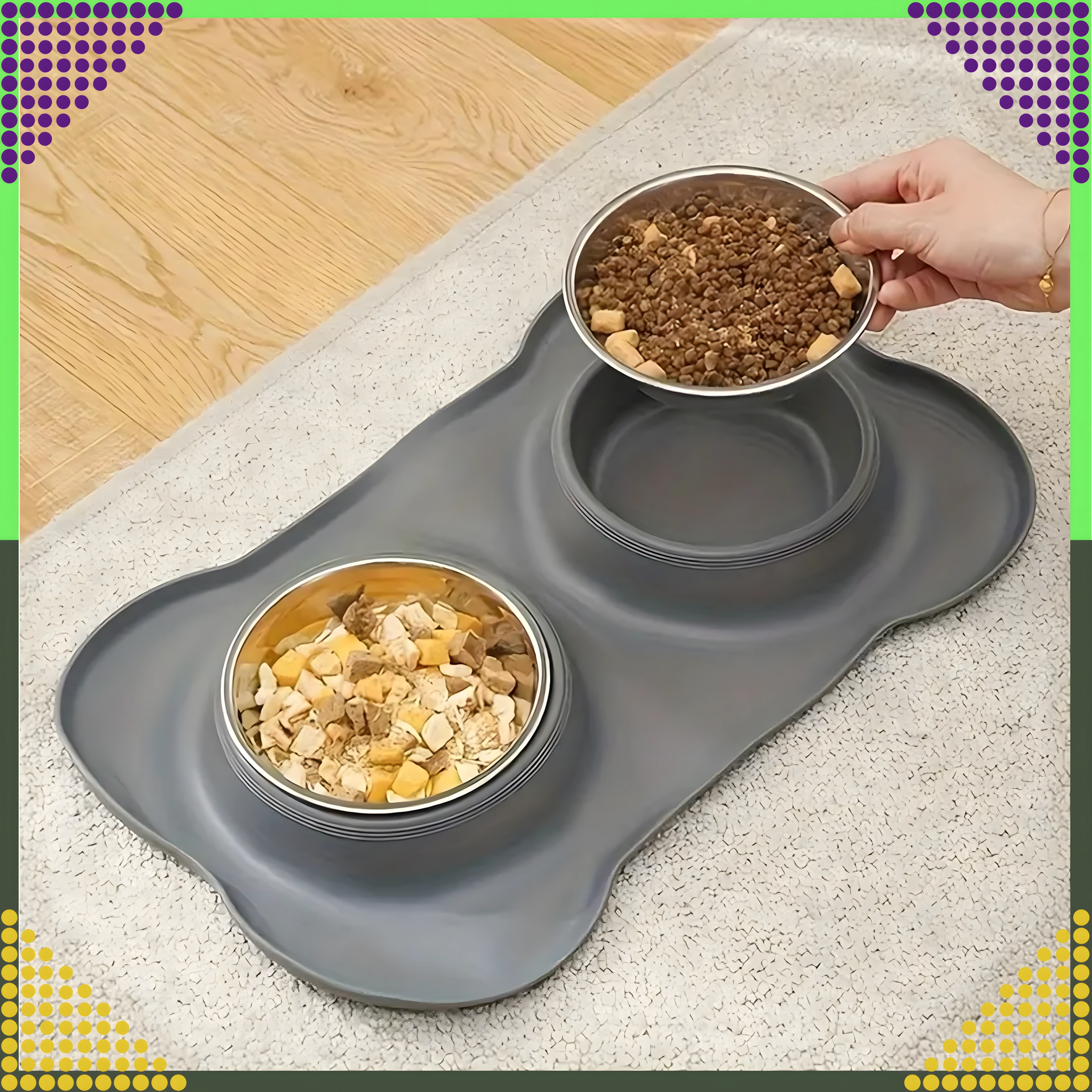 Double gamelle pour chiens et chats avec tapis en silicone antidérapant 2 × 450 ml, inox
