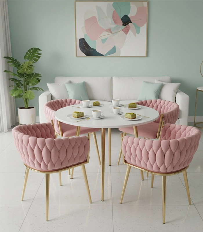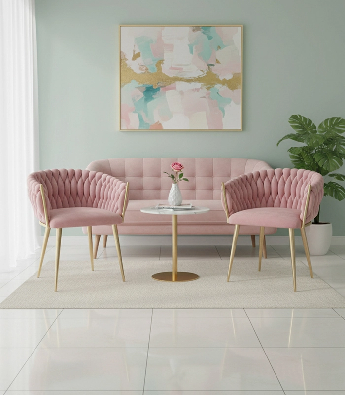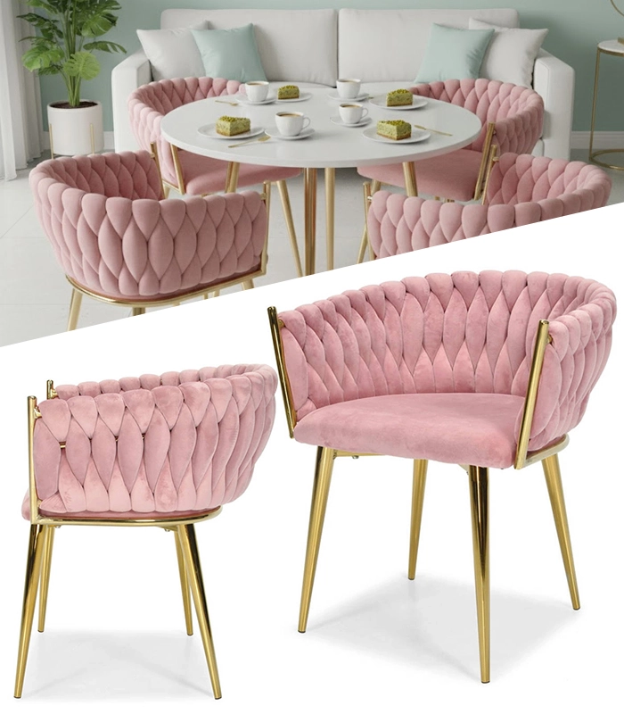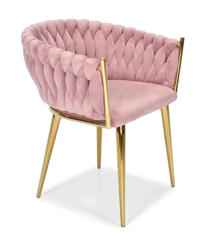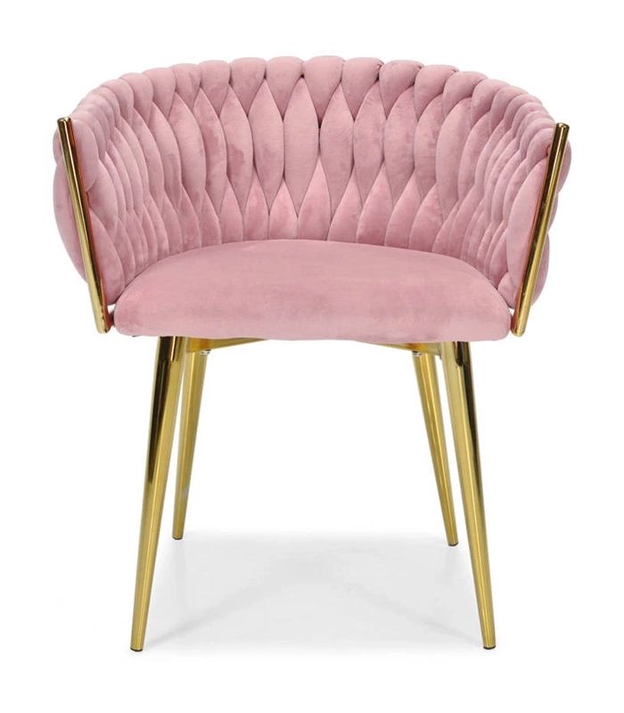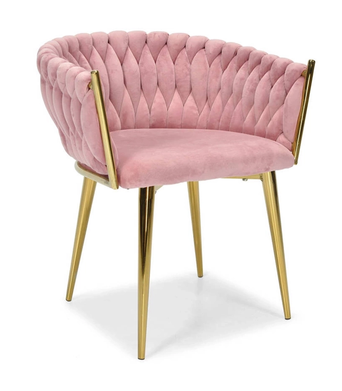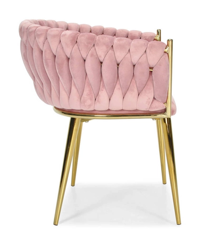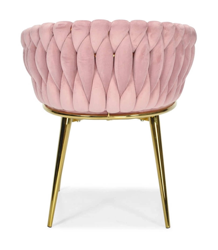 Cette chaise design est un véritable bijou pour l’intérieur. Le revêtement en velours tressé crée une structure 3D spectaculaire qui attire immédiatement le regard et dégage une grande sophistication. La couleur rose poudré est discrète tout en restant affirmée – idéale pour les décors modernes comme glamour.