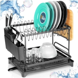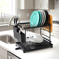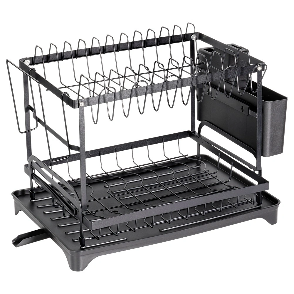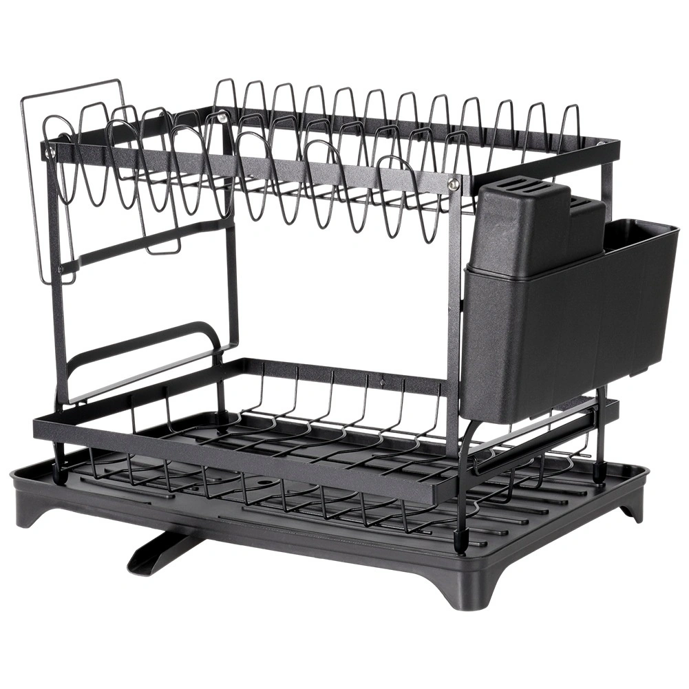 Égouttoir à vaisselle à deux niveaux, élégant et durable, en métal noir mat offrant une grande capacité et une organisation bien pensée. Le niveau supérieur accueille jusqu’à 11 assiettes, l’inférieur est idéal pour bols, mugs et verres. Il comprend un porte-couverts détachable à 4 compartiments (dont un pour couteaux), un support latéral pour planche à découper et un plateau avec bec verseur pour l’évacuation contrôlée de l’eau.