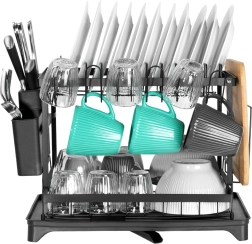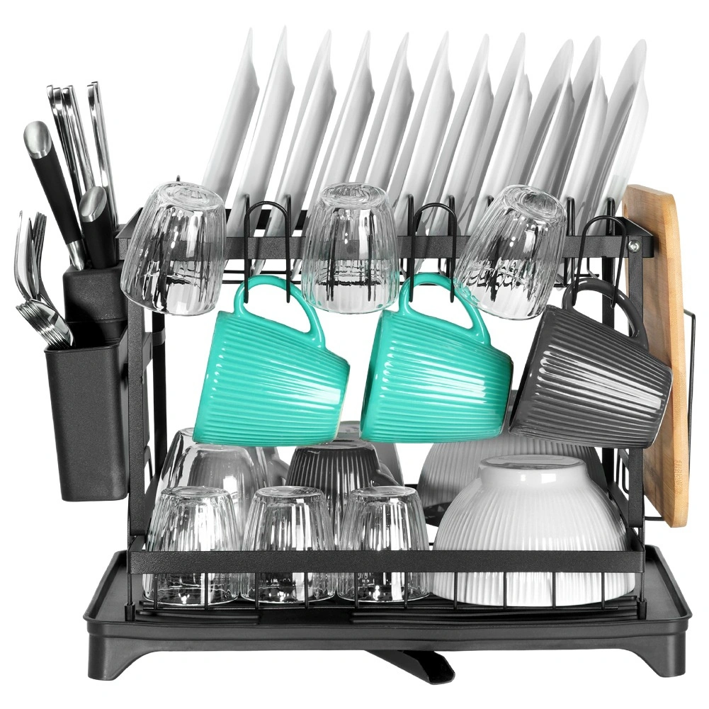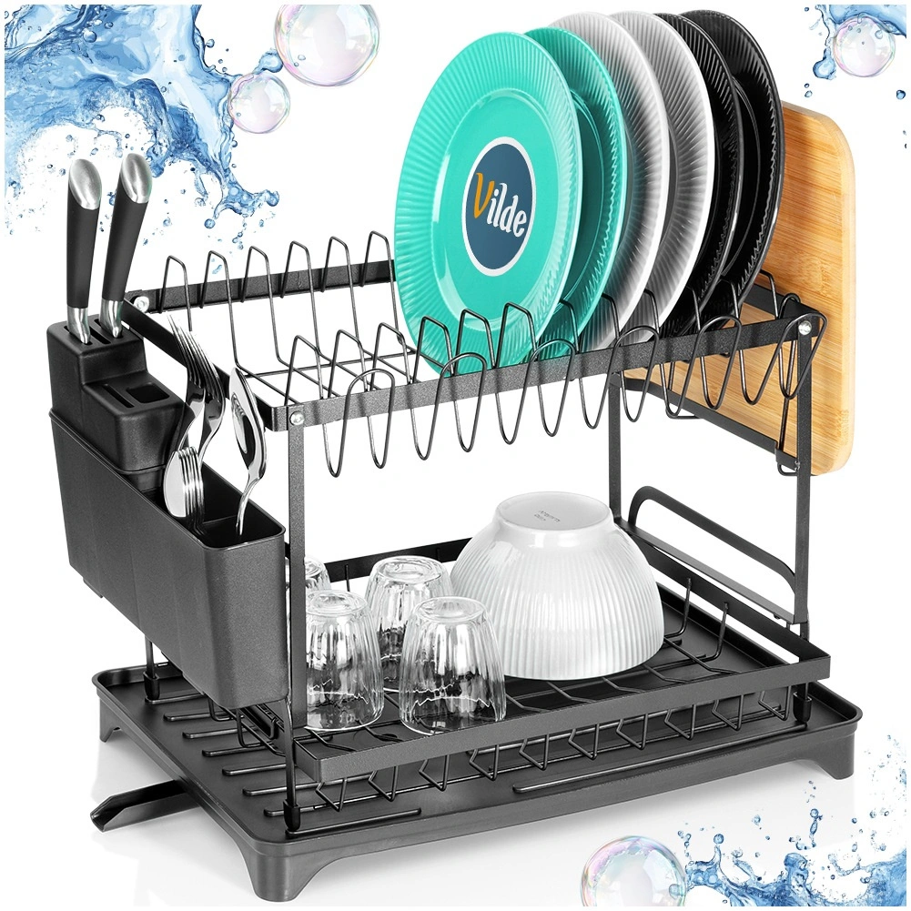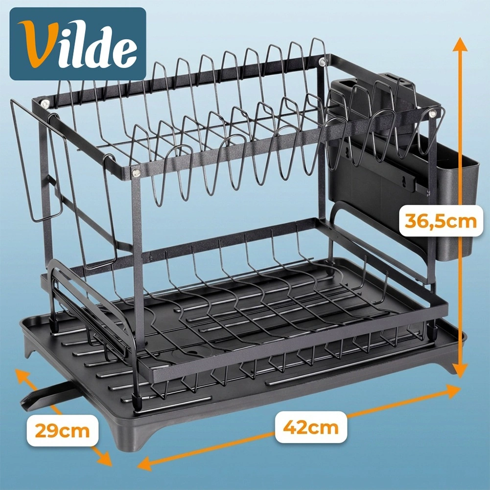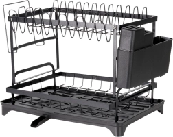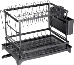 Pratique égouttoir à vaisselle à deux étages, dimensions 42 × 29 × 36,5 cm, pour un séchage rapide et ordonné des assiettes, verres et couverts. Structure métallique robuste en noir mat, porte-couverts amovible à quatre compartiments et support pour planche à découper. Le plateau avec bec verseur renvoie l’eau directement dans l’évier, gardant ainsi le plan de travail sec. Idéal pour gagner de la place et un séchage organisé dans toute cuisine.