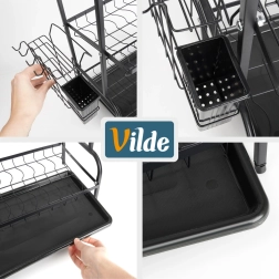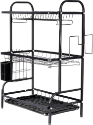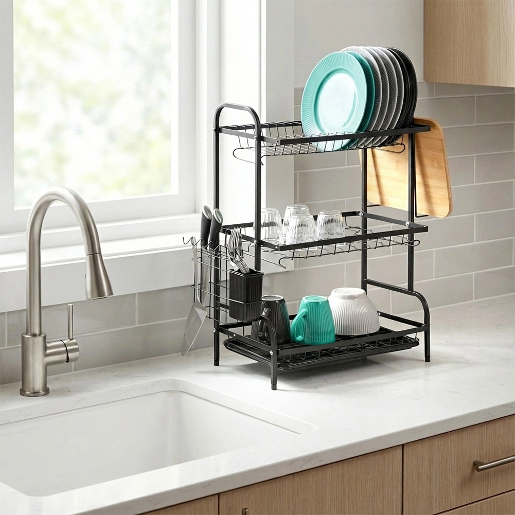 Égouttoir à vaisselle en métal à trois niveaux, en élégant noir, qui économise de la place et maintient la cuisine en ordre. Il offre une grande capacité, une structure solide et durable, un panier à couverts amovible et un porte-planche à découper. Une gouttière collectrice pratique protège le plan de travail de l’eau et facilite l’entretien.