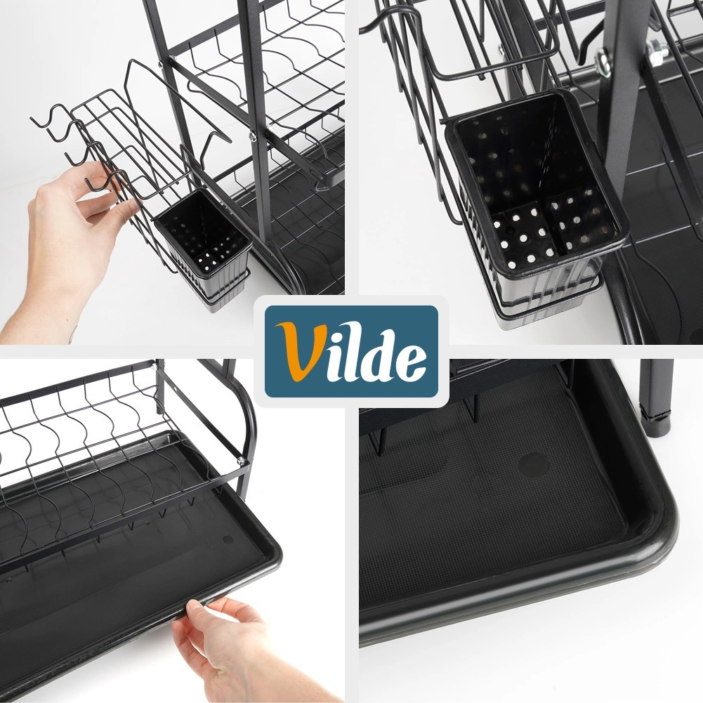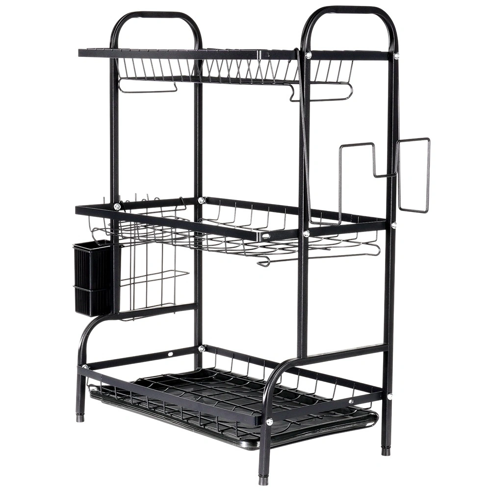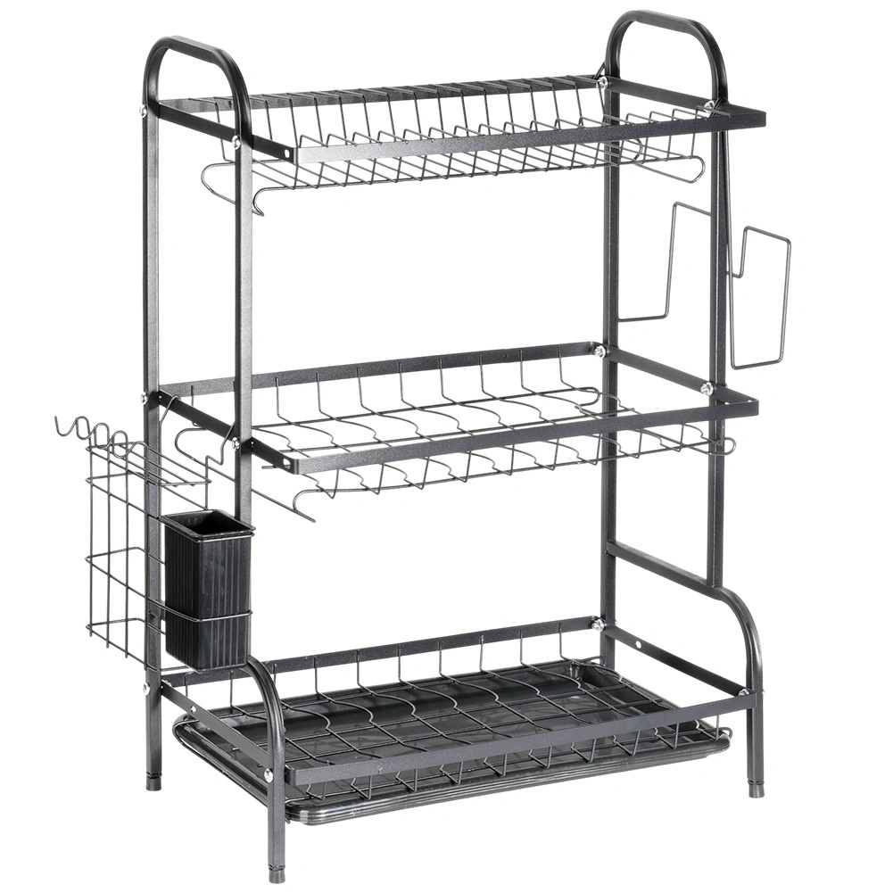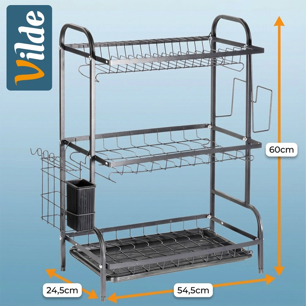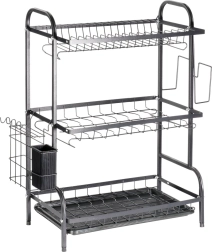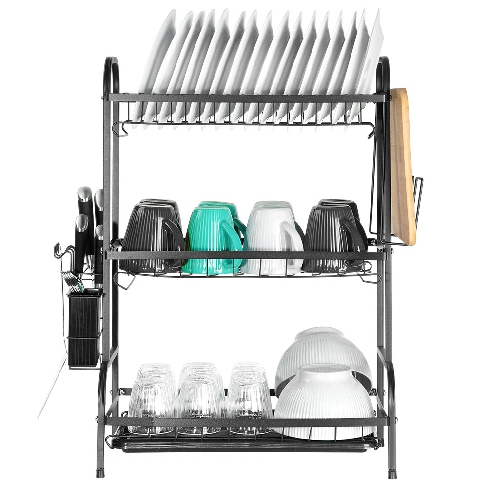 Optimisez l’espace près de l’évier avec cet égouttoir noir à trois niveaux en métal résistant. L’étage supérieur accueille jusqu’à 16 assiettes, les niveaux inférieurs sont idéaux pour bols, verres et tasses. Le panier à couverts amovible et le porte-planche latéral augmentent la surface de séchage, tandis que le plateau d’égouttage amovible recueille l’eau et garde le plan sec.