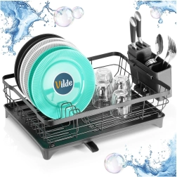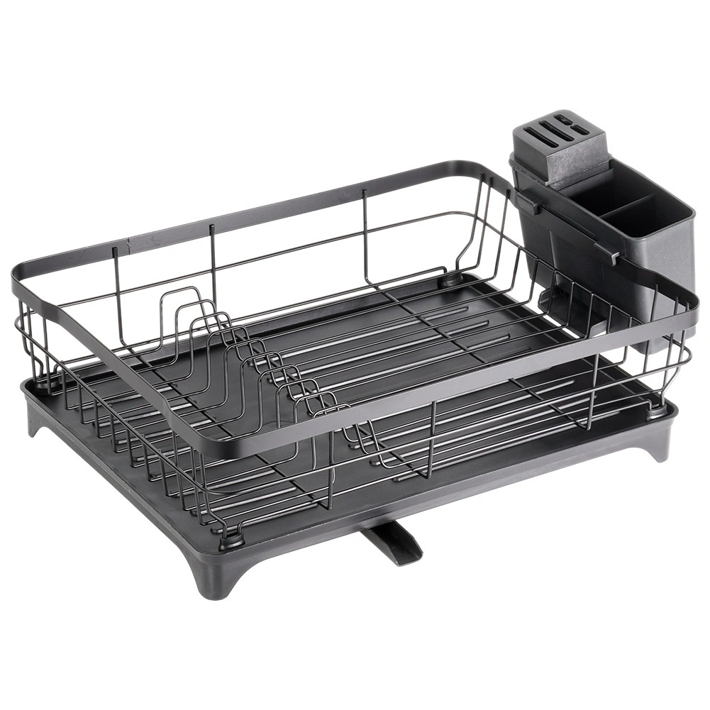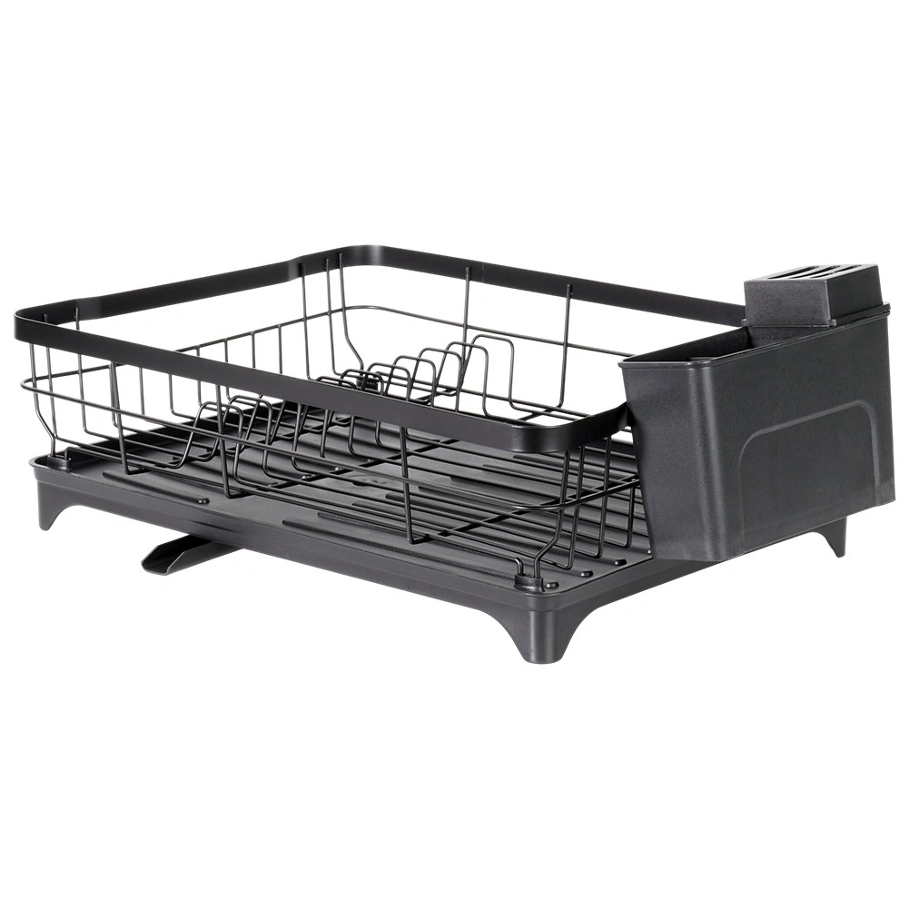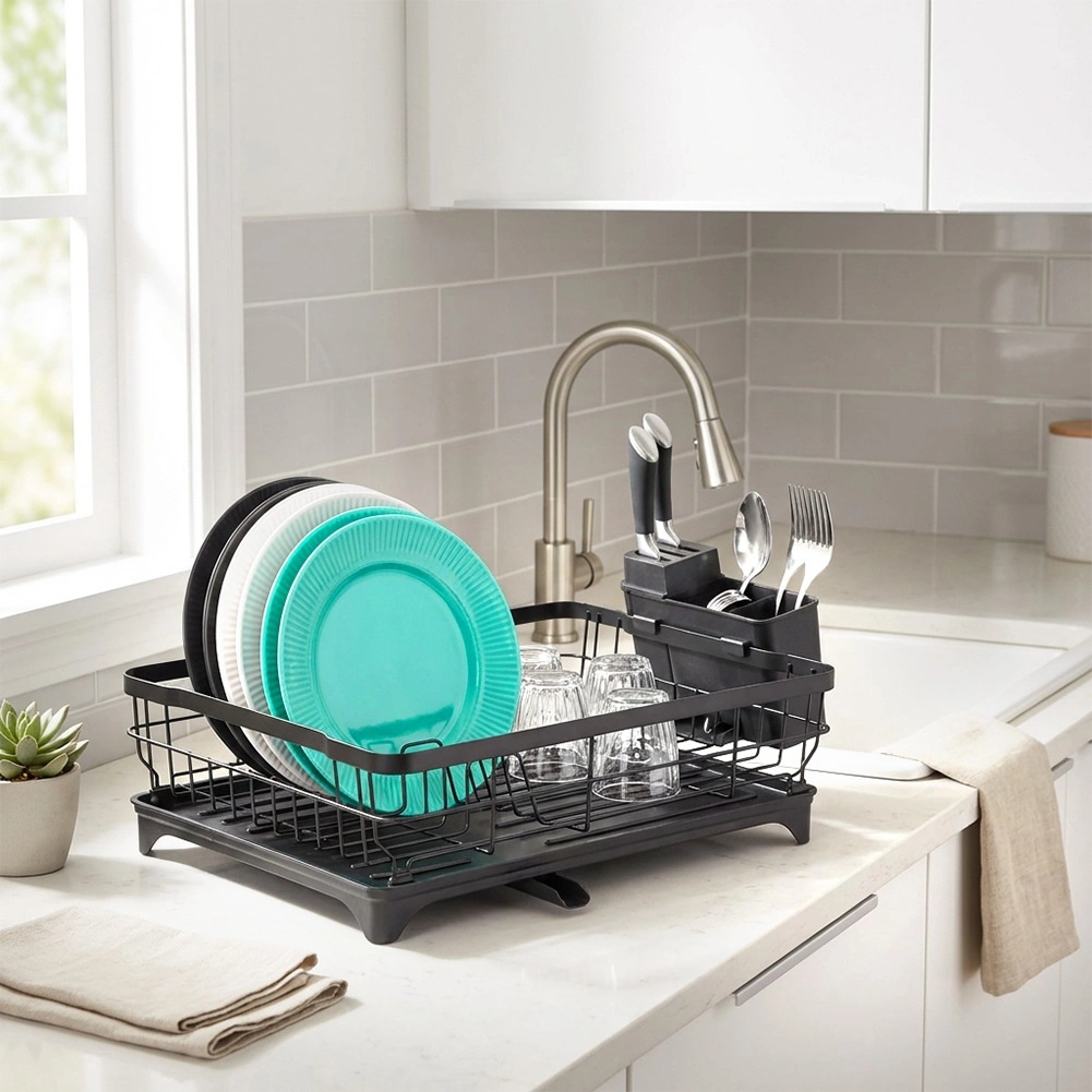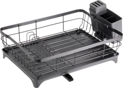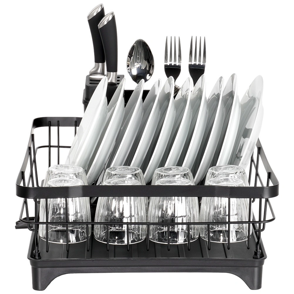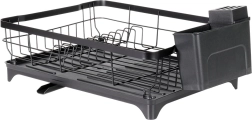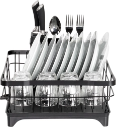 Le métal noir résistant peut accueillir jusqu’à 10 assiettes, des verres et des bols. Les bords relevés assurent stabilité et rangement sécurisé de la vaisselle.
