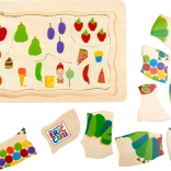 Les motifs colorés de fruits et de la chenille favorisent la reconnaissance des formes et des couleurs, entraînent la coordination œil–main et améliorent la concentration.
