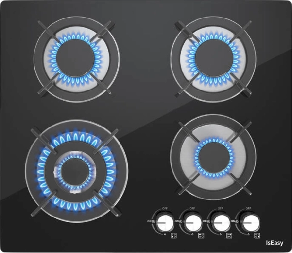 Iseasy plaque de cuisson à gaz avec surface en verre, 4 brûleurs