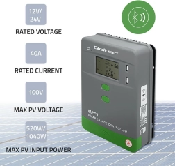 Régulateur de charge solaire hautement efficace avec technologie MPPT pour une exploitation maximale de l’énergie des panneaux solaires. Il offre adaptation automatique 12/24 V, courant 40 A, écran LCD, Bluetooth et application mobile pour la surveillance à distance, 2× USB pour la charge rapide et un capteur de température pour la protection et une durée de vie prolongée de la batterie. Compatible avec les batteries GEL et LiFePO4.