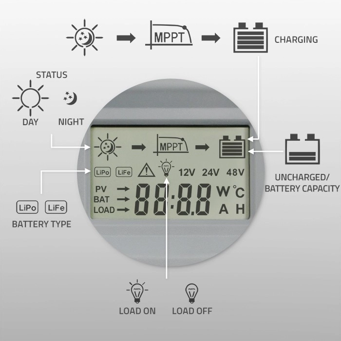 L’écran LCD intégré et le Bluetooth avec application mobile permettent un réglage clair et une surveillance à distance. Le capteur de température externe protège la batterie contre la surchauffe et la surcharge. Le régulateur est compatible avec les batteries GEL et LiFePO4, garantissant des profils de charge précis et une durée de vie accrue.
