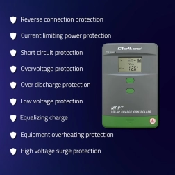 - Éléments de sécurité – protection contre les courts-circuits, les surcharges, la surcharge de batterie, la décharge excessive et l’inversion de polarité.