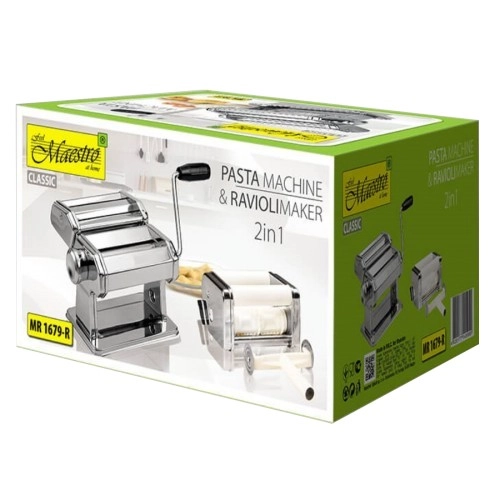 Découvrez la fabrication de pâtes maison avec la machine manuelle 3-en-1 Maestro MR-1679R en acier inoxydable. Elle étale facilement des feuilles pour lasagnes, coupe des nouilles de 2 mm et 6,5 mm et, grâce à son accessoire à raviolis (4,5 × 4,5 cm), crée des carrés réguliers. Elle offre 9 niveaux d’épaisseur (0,3–3 mm) et une largeur de pâte jusqu’à 14,5 cm pour un résultat parfait.