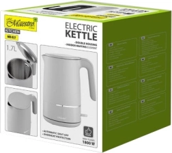 Bouilloire électrique MAESTRO élégante d’une capacité de 1,7 l et d’une puissance de 1800 W, offrant une ébullition rapide, une utilisation sûre grâce à la double paroi et une conception hygiénique en acier inoxydable 304. Sa base rotative à 360° et son coloris gris élégant s’intègrent parfaitement dans toute cuisine.